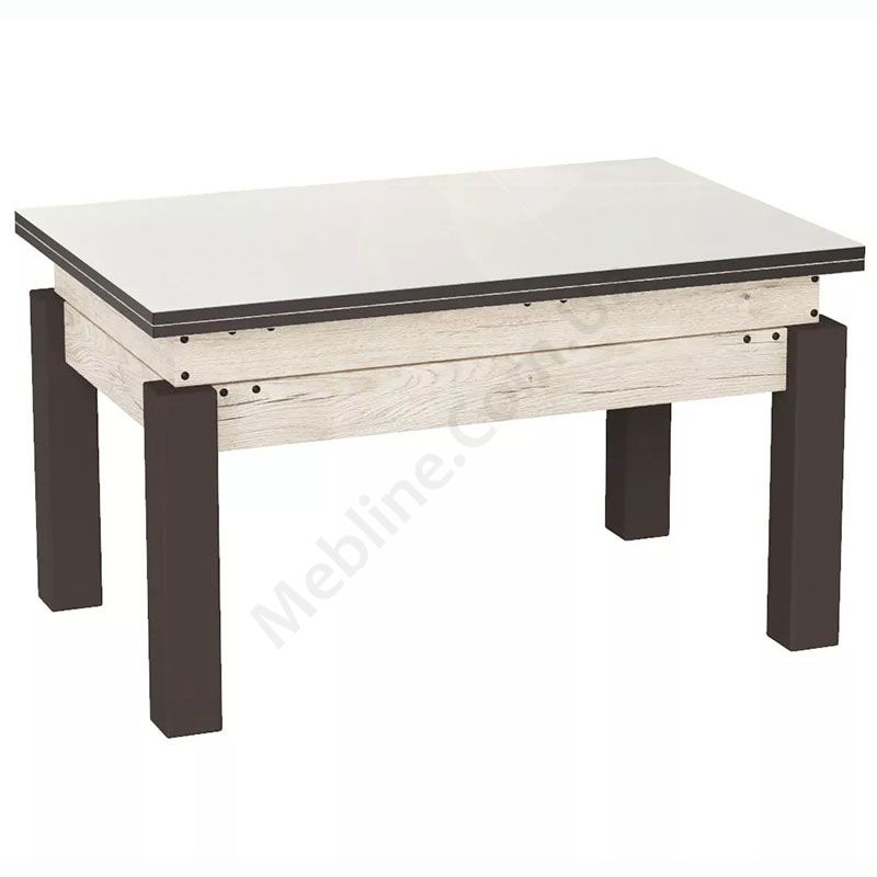 Журнальний стіл на дерев’яних ніжках, який трансформується в обідній, зі скляною стільницею білого кольору.