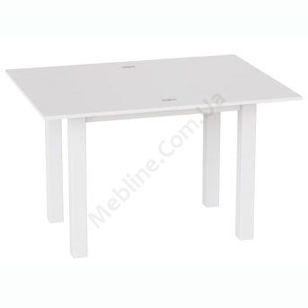 Кухонний розкладний стіл на білих дерев’яних ніжках з ДСП стільницею білого кольору.