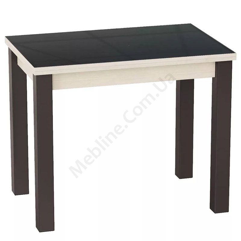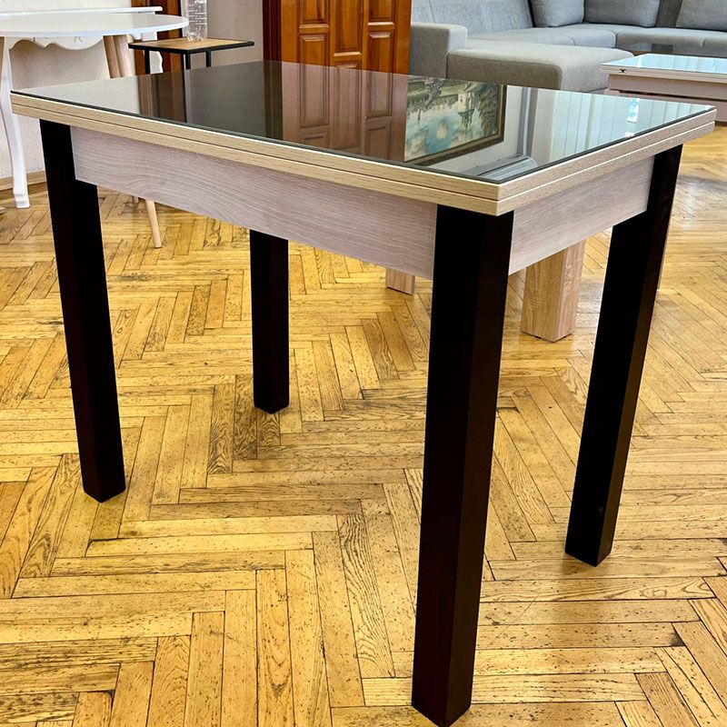 Кухонний розкладний стіл на дерев’яних ніжках зі скляною стільницею кольору графіт.
