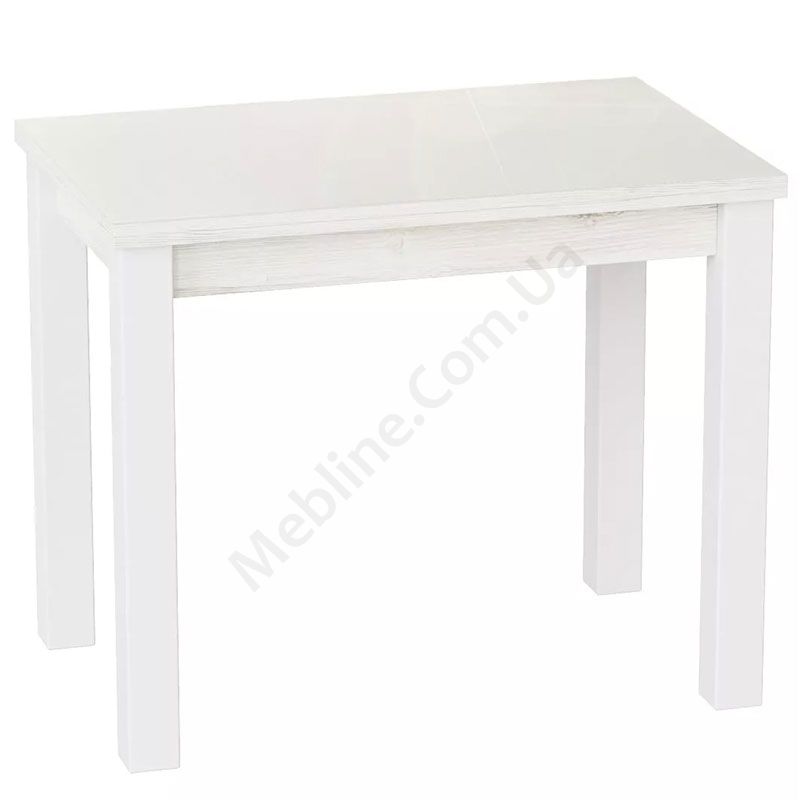 Кухонний розкладний стіл на дерев’яних ніжках зі скляною стільницею білого кольору.