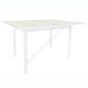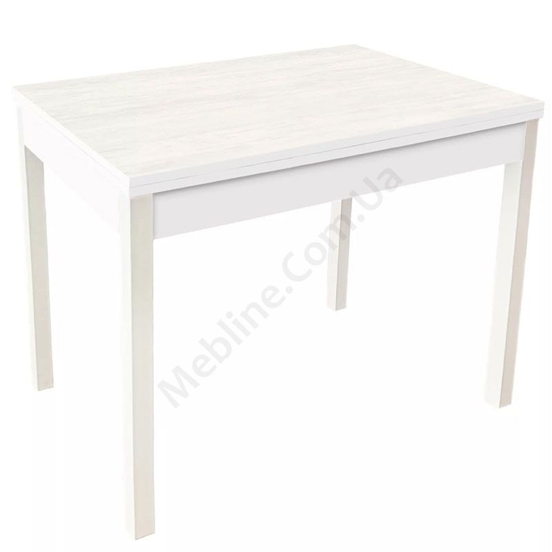 Кухонний розкладний стіл на білих металевих ніжках з ДСП стільницею кольору артвуд світлий.