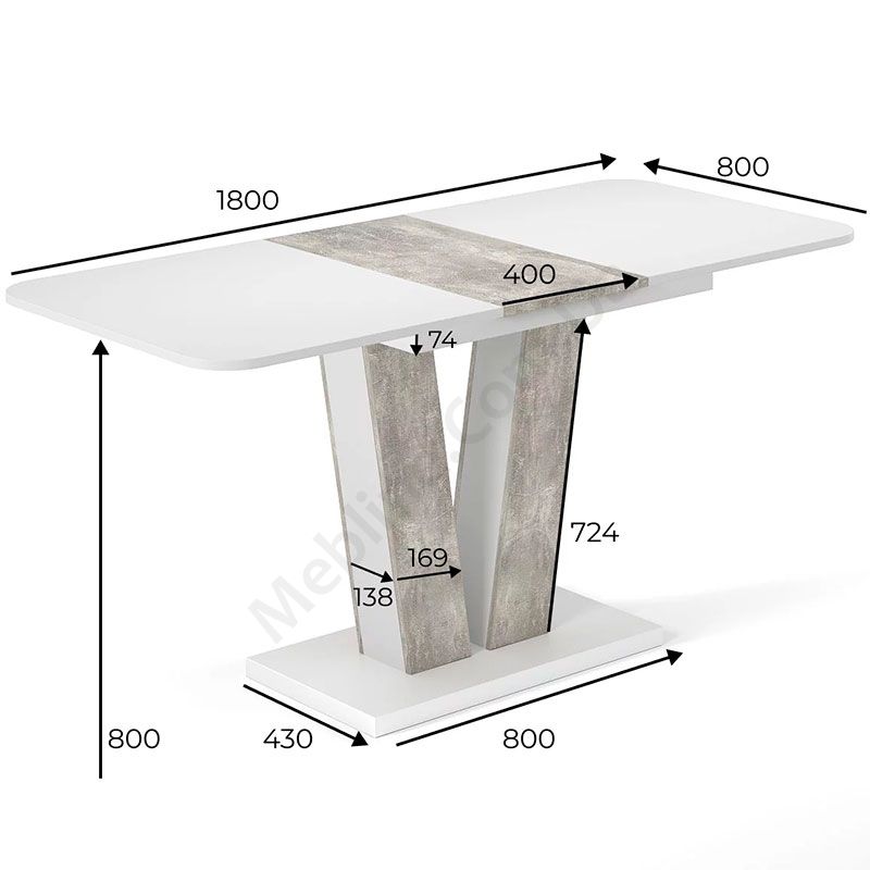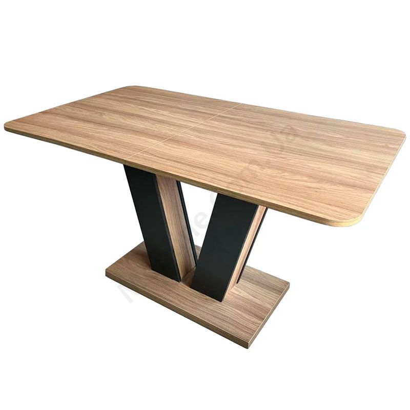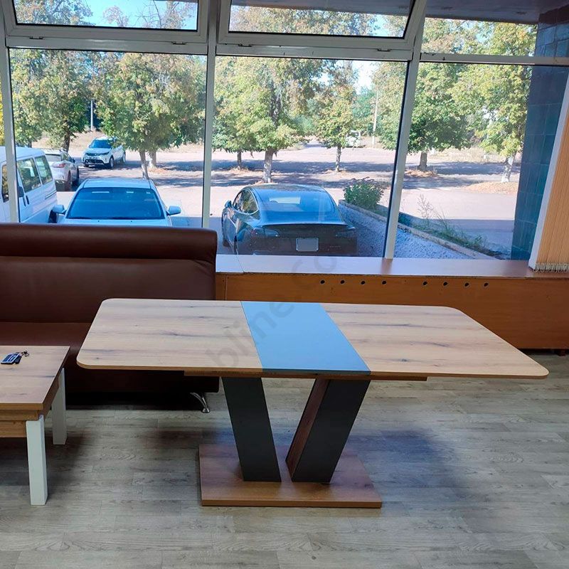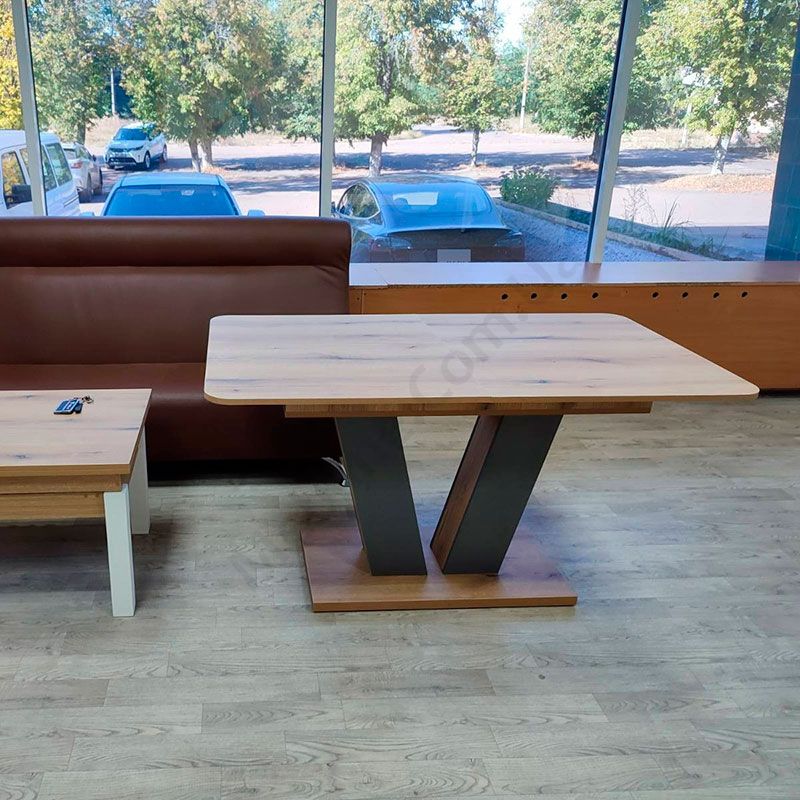Розкладний кухонний стіл з ДСП на стійкій основі.