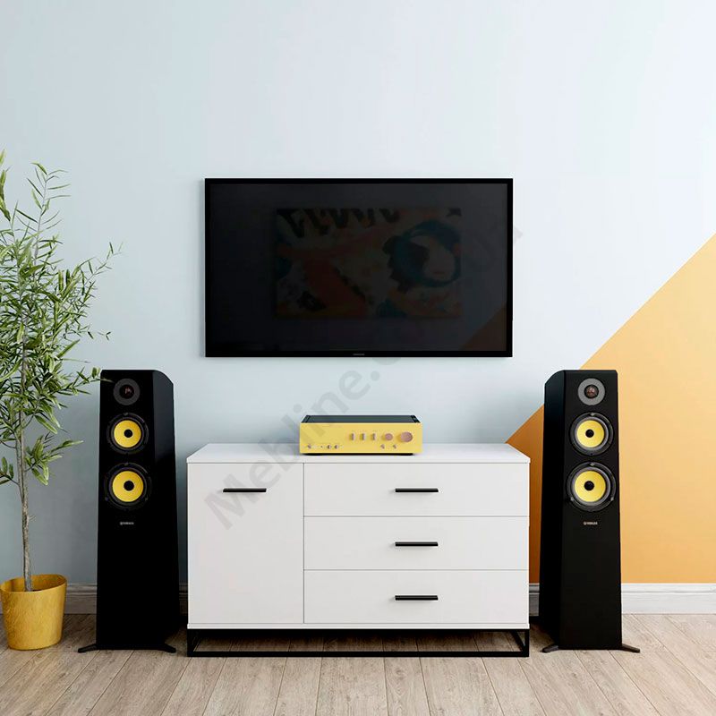 Комод на металевих ніжках з висувними шухлядами та дверцятами.