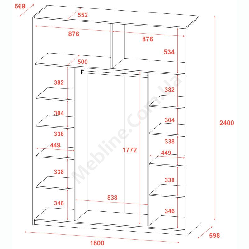 Дводверна шафа-купе шириною 180 см, глибиною 60 см, висотою 240 см.
