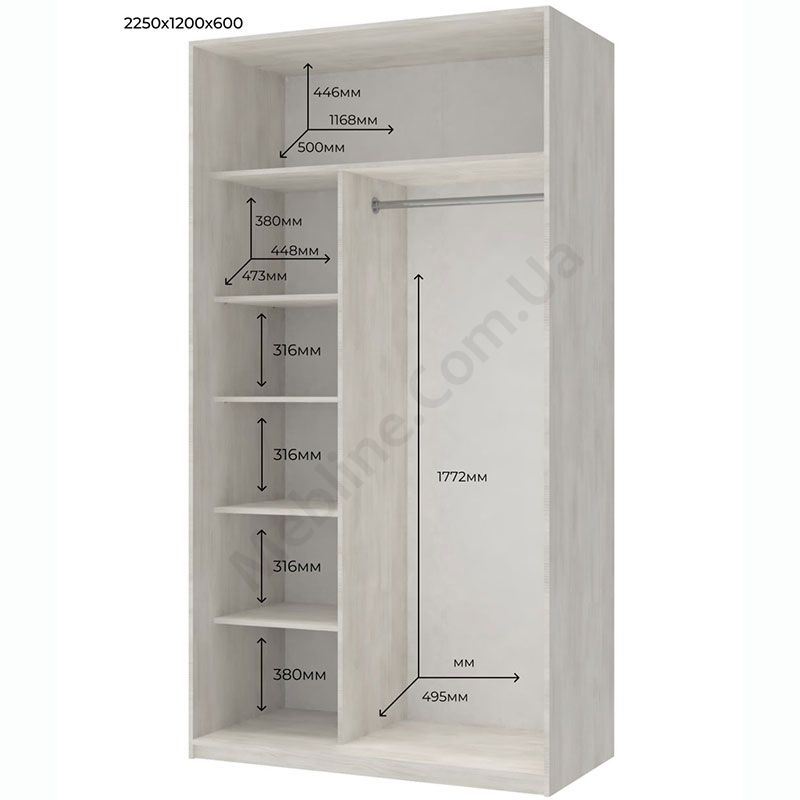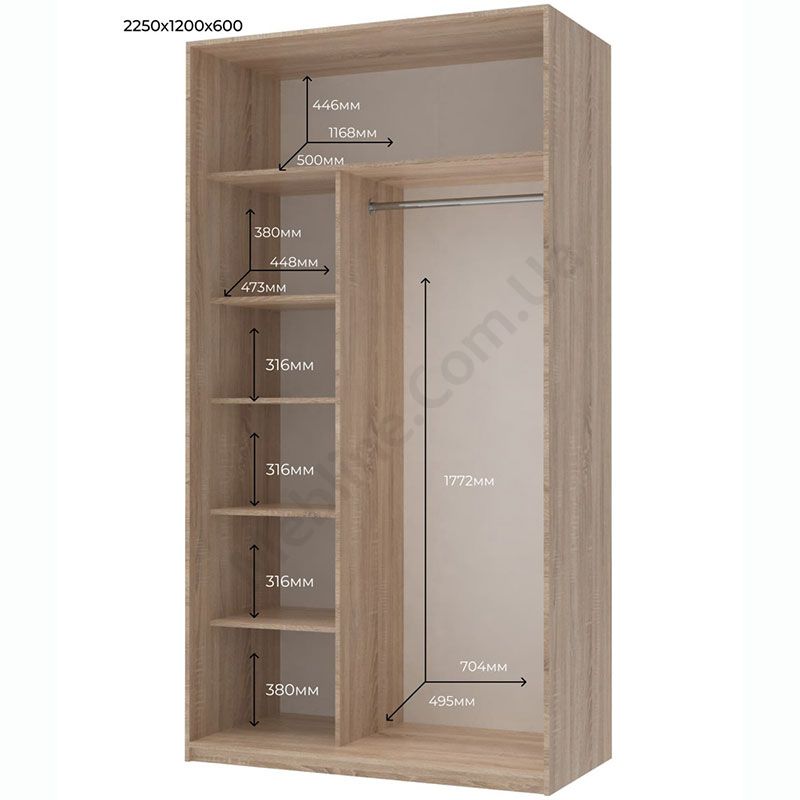 Дводверна шафа-купе шириною 120 см, глибиною 60 см, висотою 225 см.