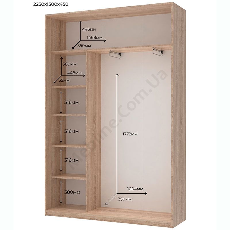 Дводверна шафа-купе шириною 150 см, глибиною 45 см, висотою 225 см.
