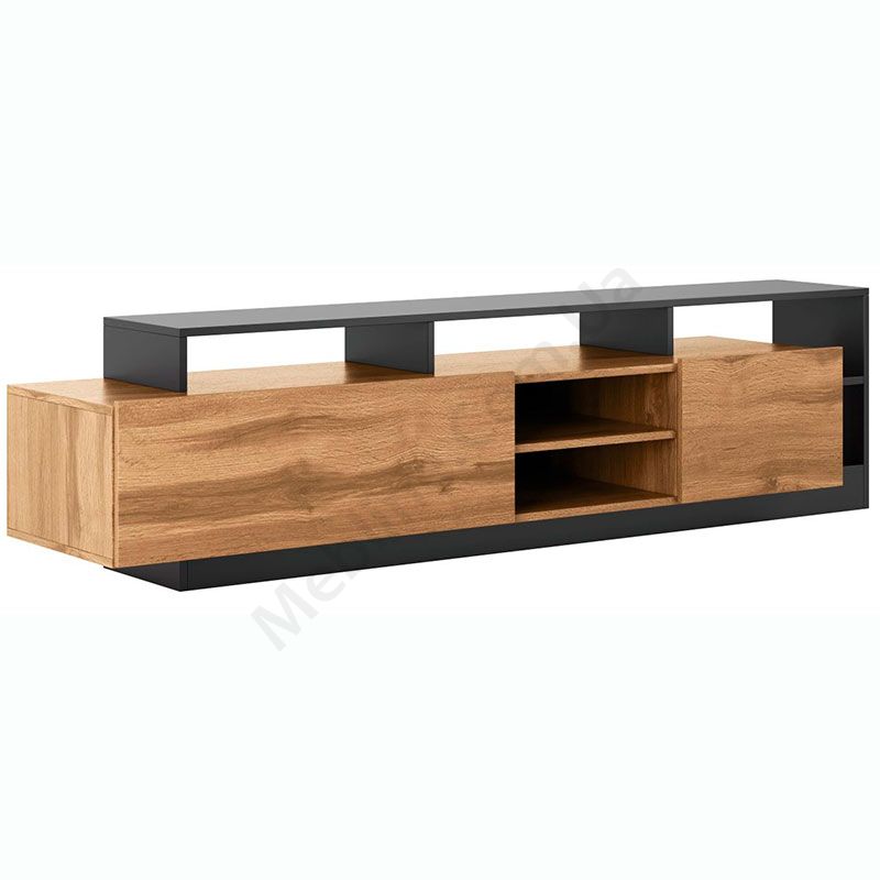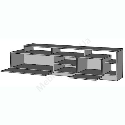 Тумба під телевізор з відкидними дверцятами та відкритими полицями.