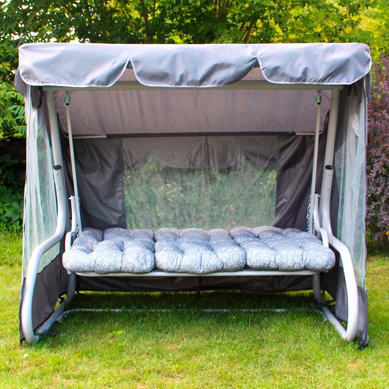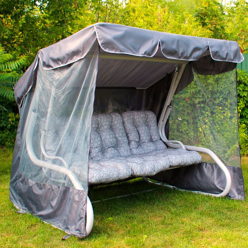Садова гойдалка з відкидною спинкою та москітною сіткою на каркасі сірий металік.