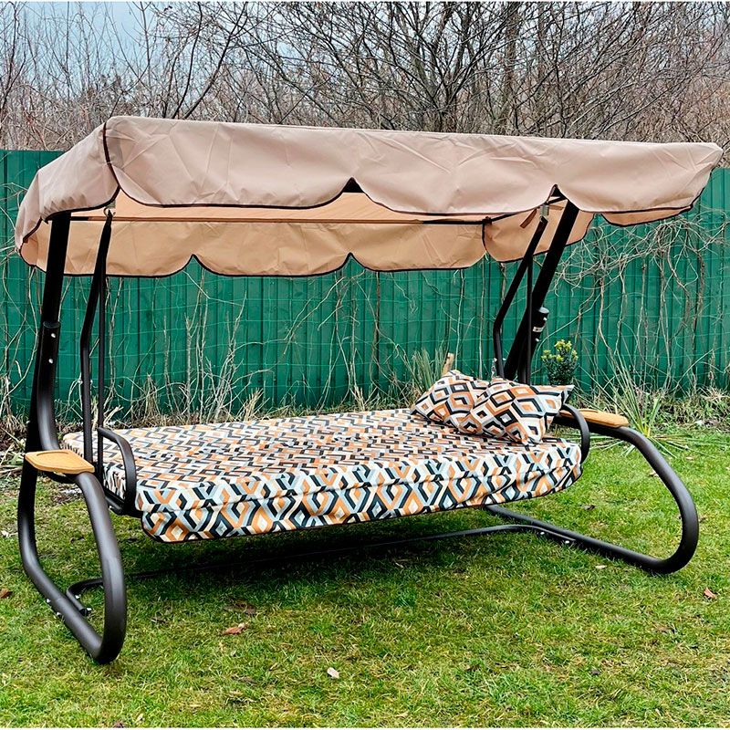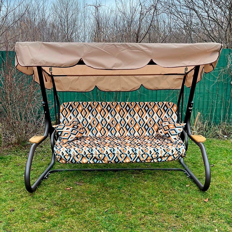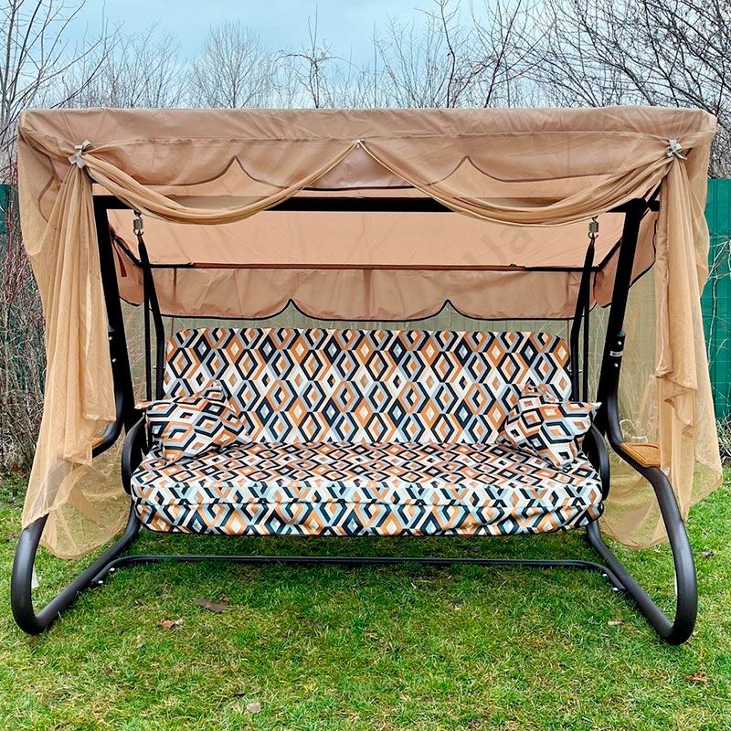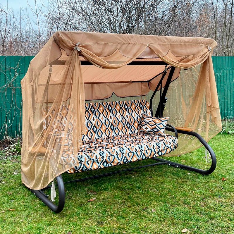 Садова гойдалка з відкидною спинкою та москітною сіткою на чорному каркасі.