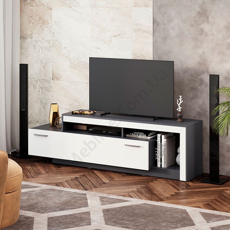Тумба під телевізор з відкритими полицями та дверцятами.