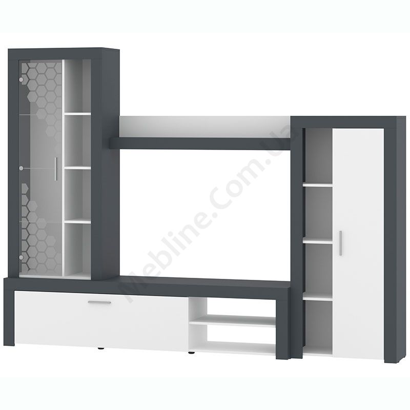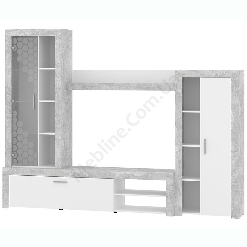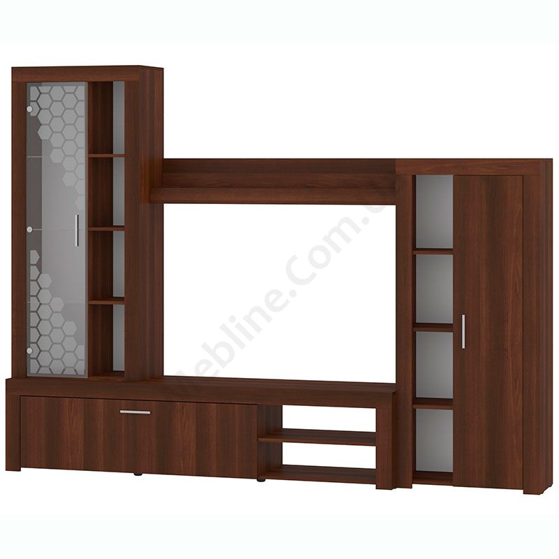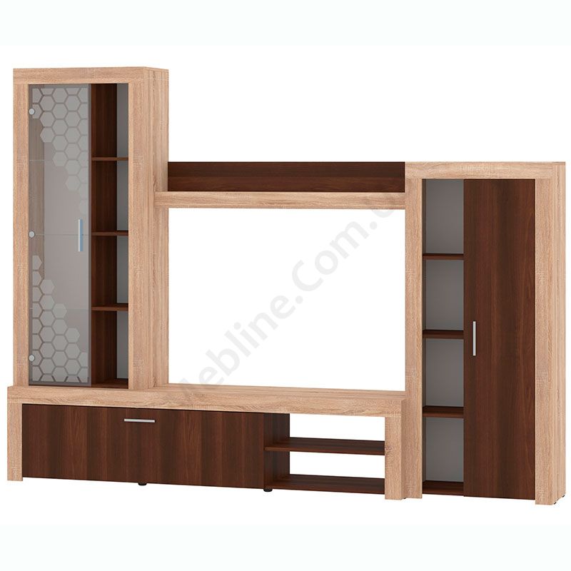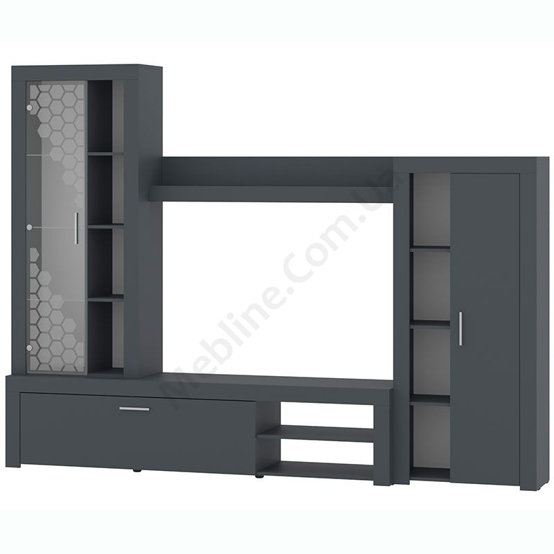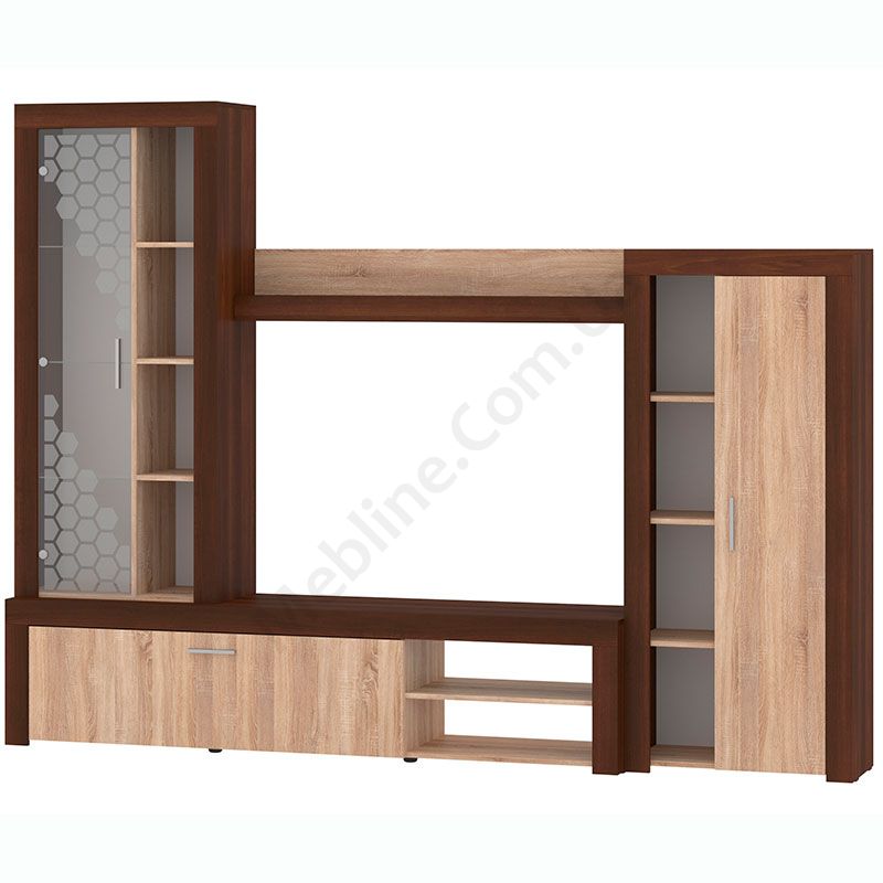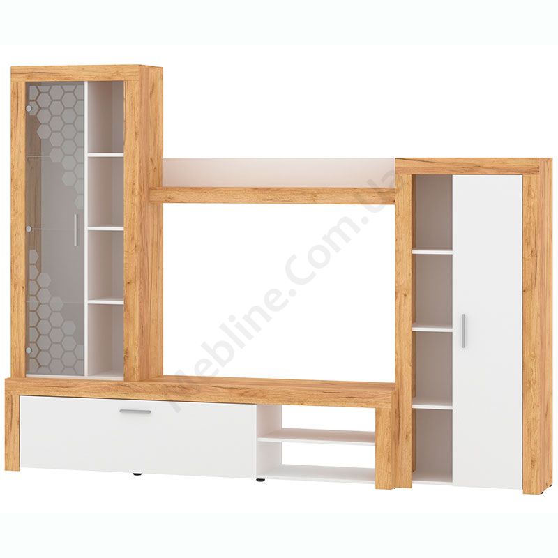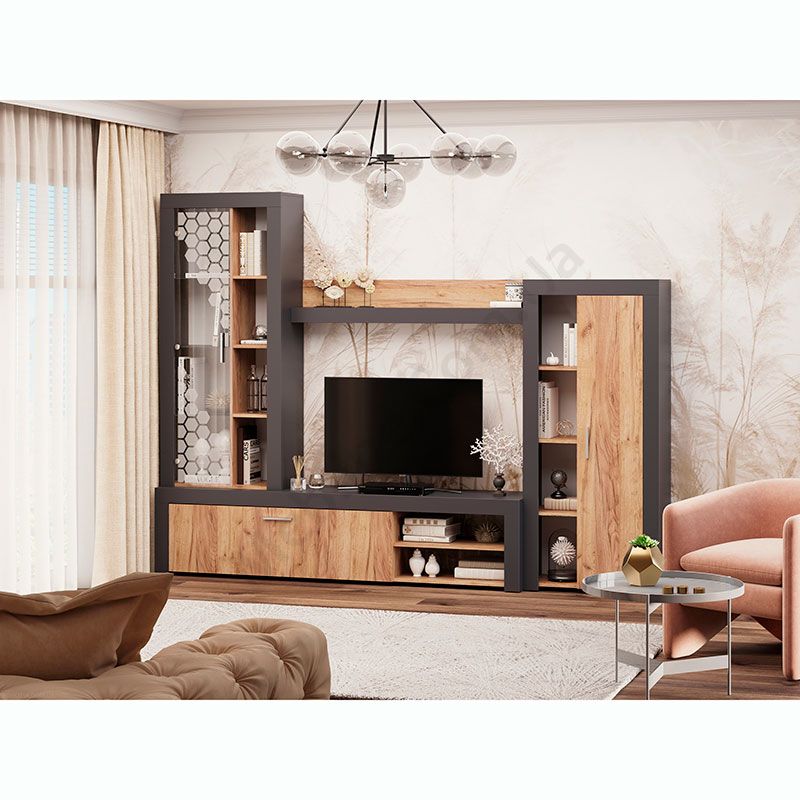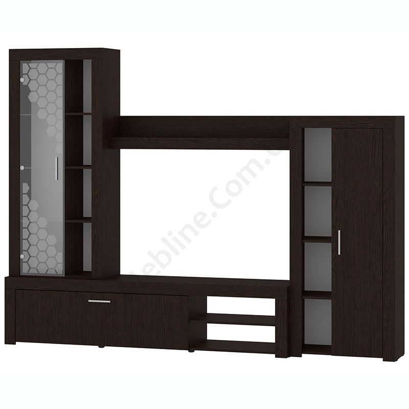 Стінка у вітальню з тумбою під телевізор, вітриною і стелажем.