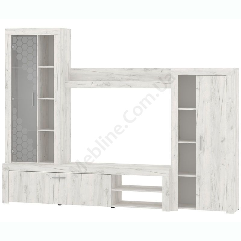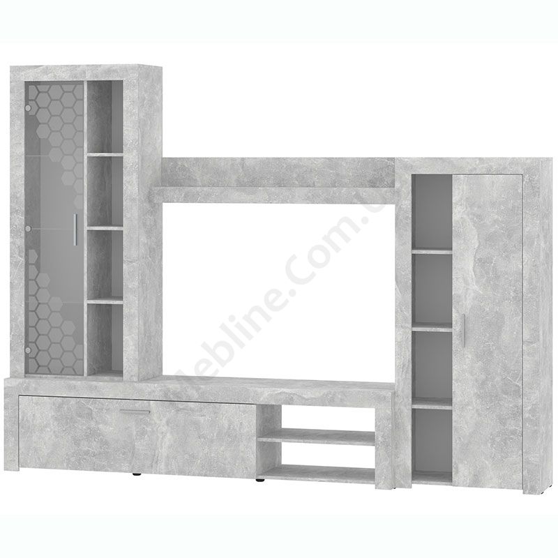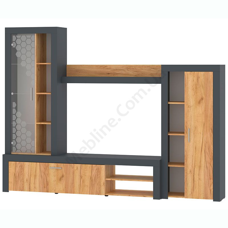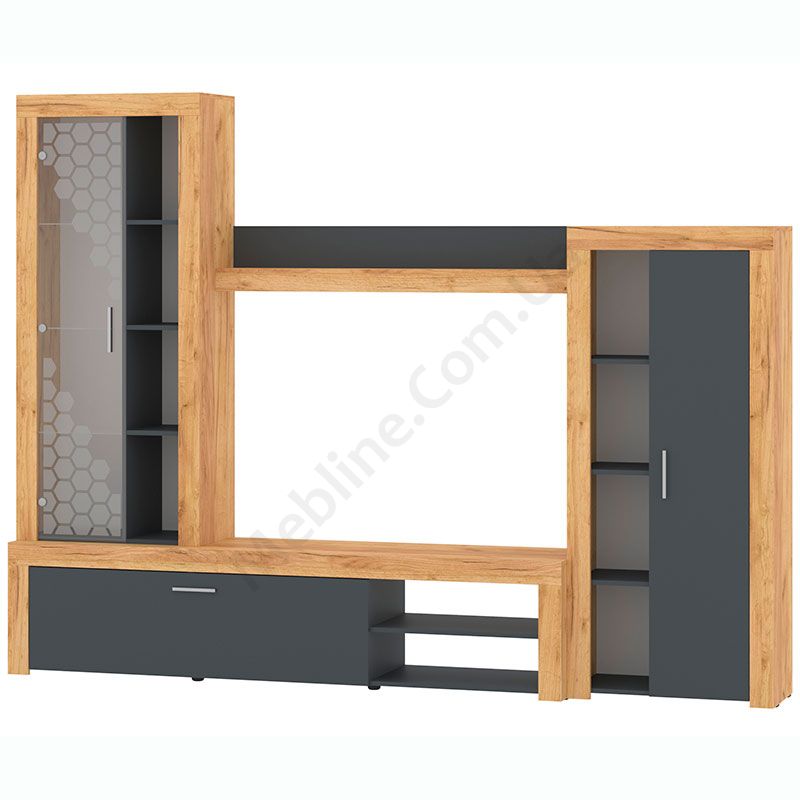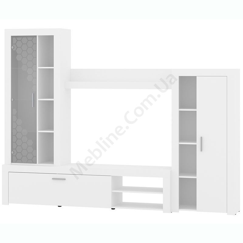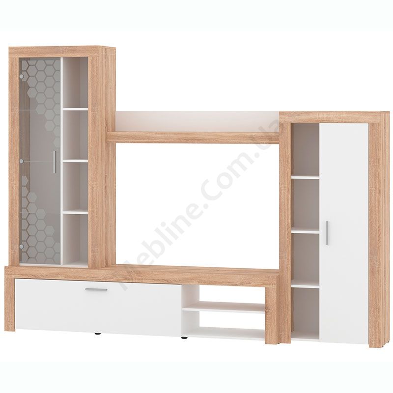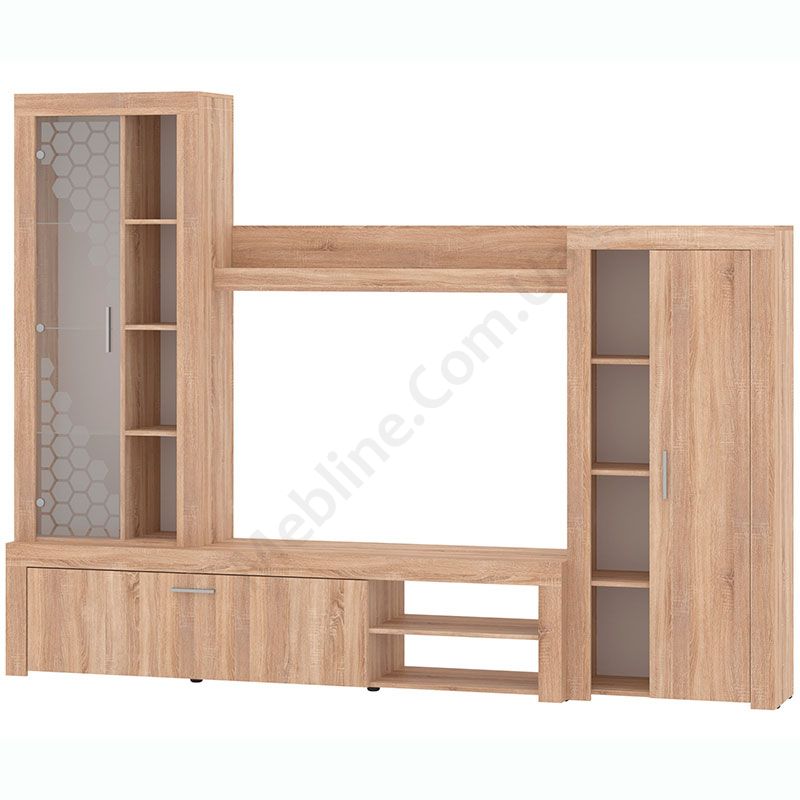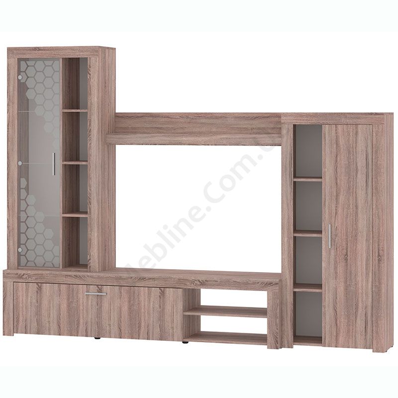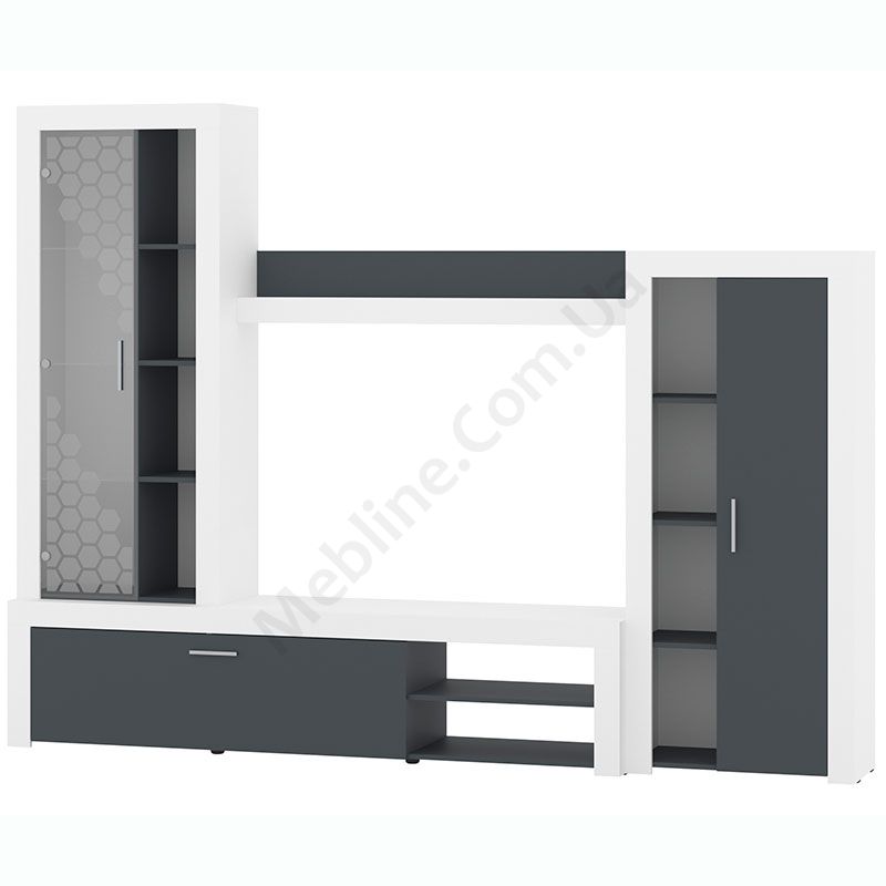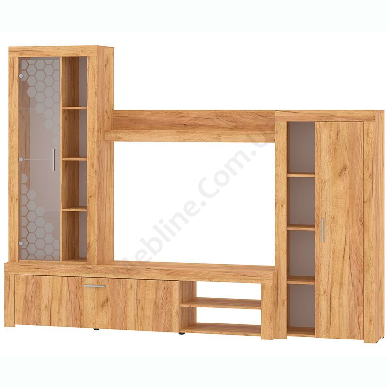 Стінка у вітальню з тумбою під телевізор, вітриною і стелажем.