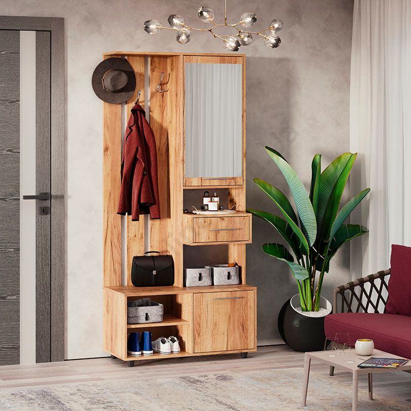 Передпокій з дзеркалом, вішаком та секціями для взуття.