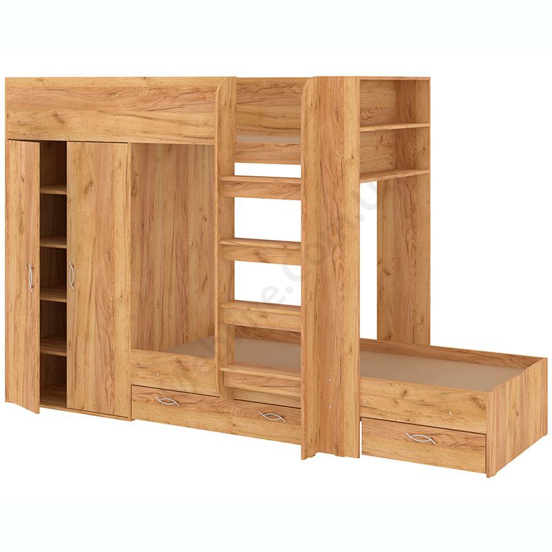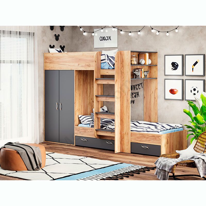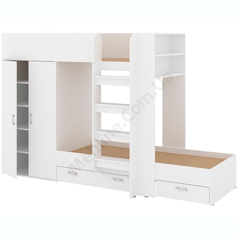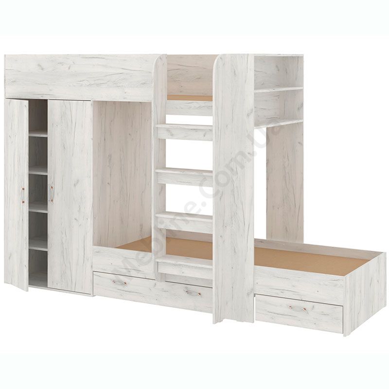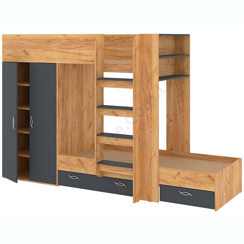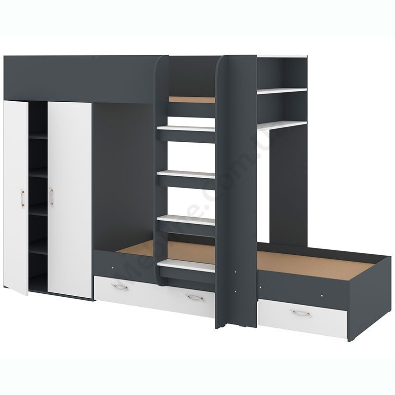 Двох’ярусне ліжко з шафою та шухлядами для зберігання.