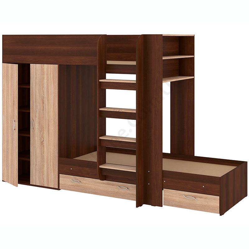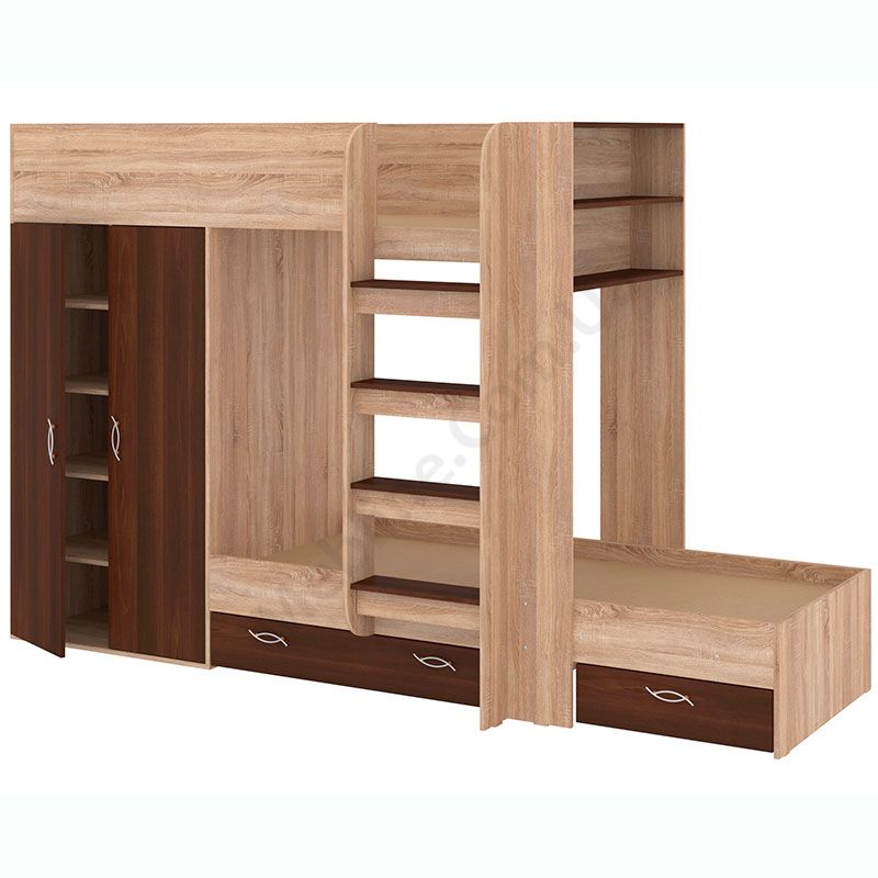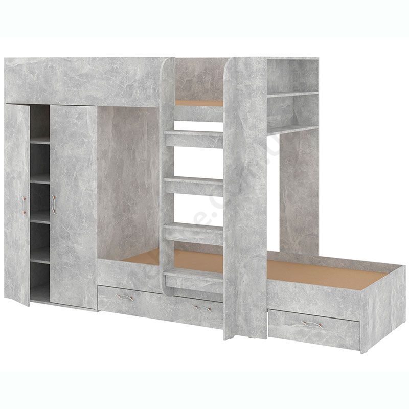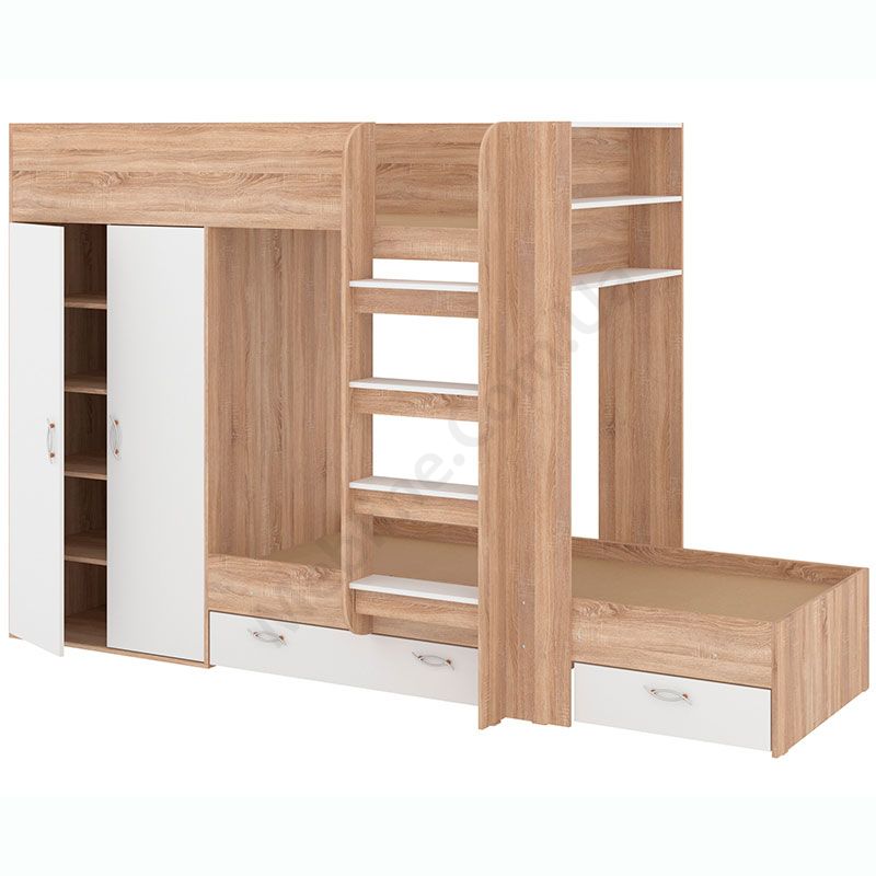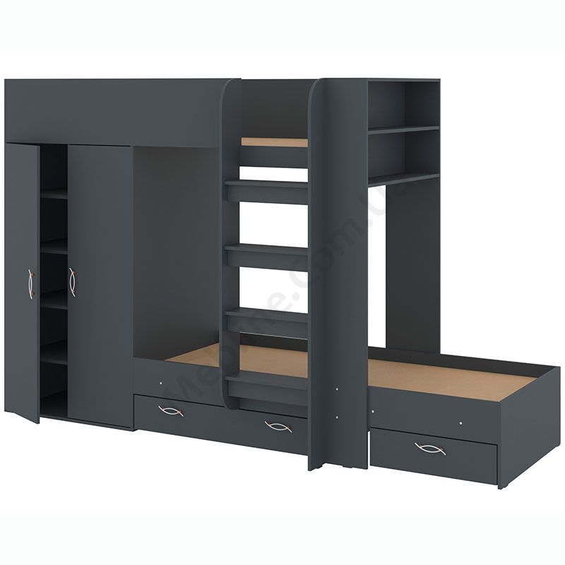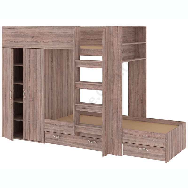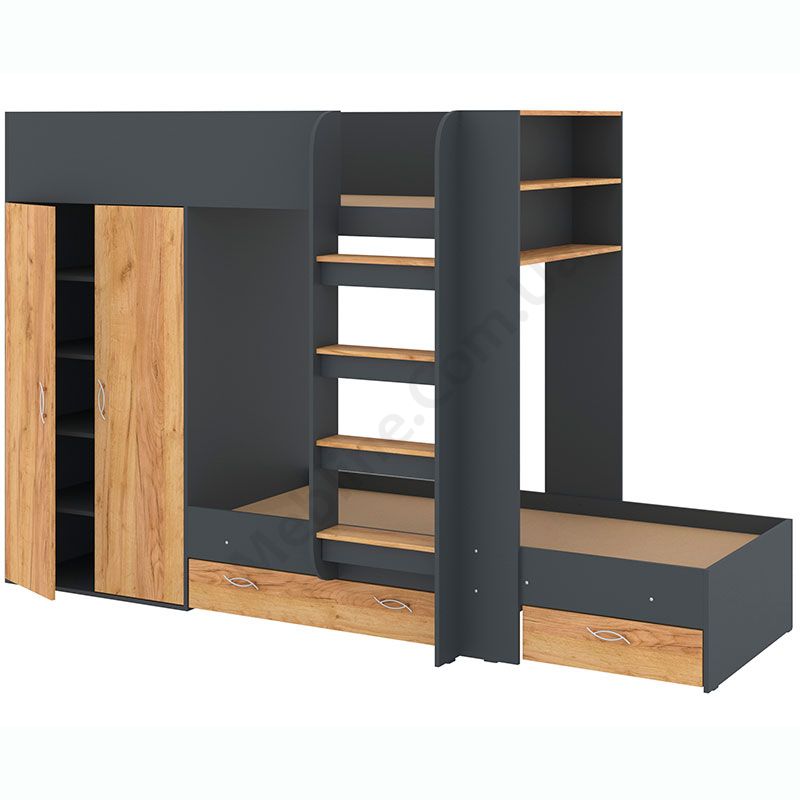 Двох’ярусне ліжко з шафою та шухлядами для зберігання.