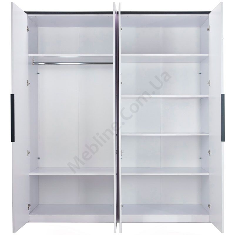 Чотиридверна шафа зі штангою для одягу та поличками.