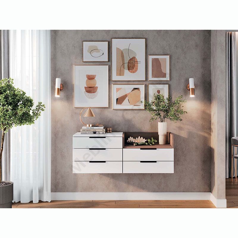 Навісна тумба під телевізор з висувними шухлядами та відкритою полицею.