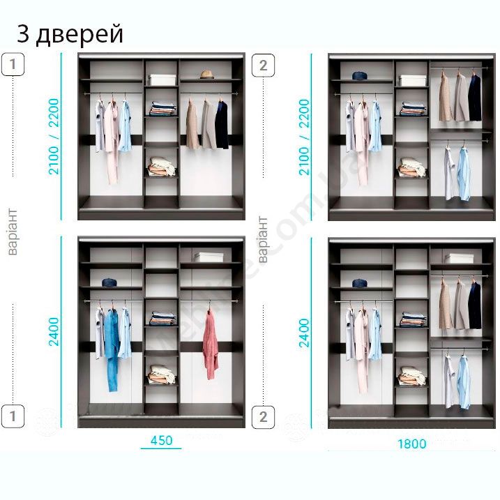 • Можливі чотири варіанти наповнення — з 1 мікроліфтом для довгого одягу або з 2 для короткого (для дводверної шафи) та з 2 мікроліфтами для довгого одягу або з 1 для довгого + 2 для короткого (для тридверної шафи) .
