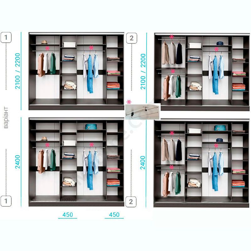 Тридверна або чотиридверна шафа-купе шириною 260 см, глибиною 45 см, висотою 210, 220 чи 240 см.