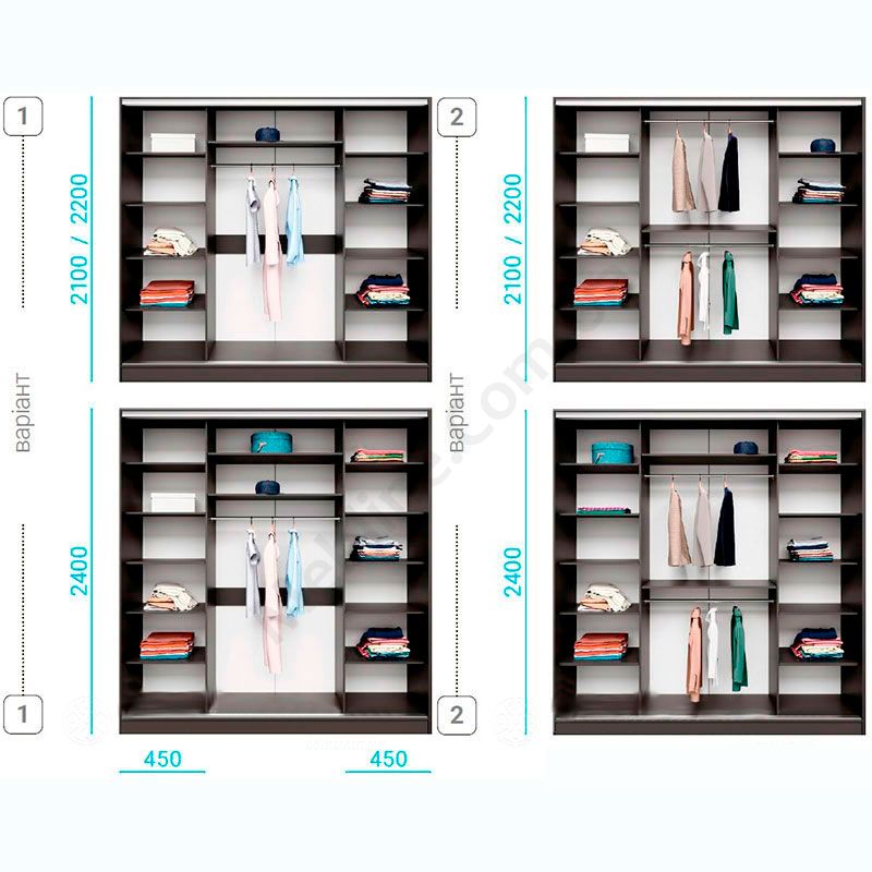 Тридверна шафа-купе шириною 210 см, глибиною 60 см, висотою 210, 220 чи 240 см.