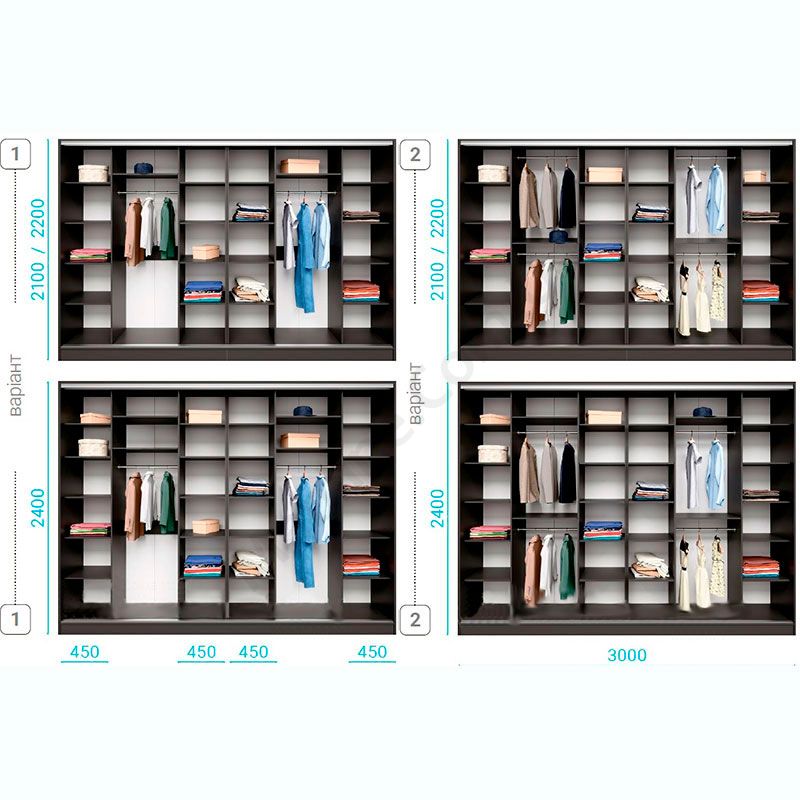 Чотиридверна шафа-купе шириною 360 см, глибиною 45 см, висотою 210, 220 чи 240 см.