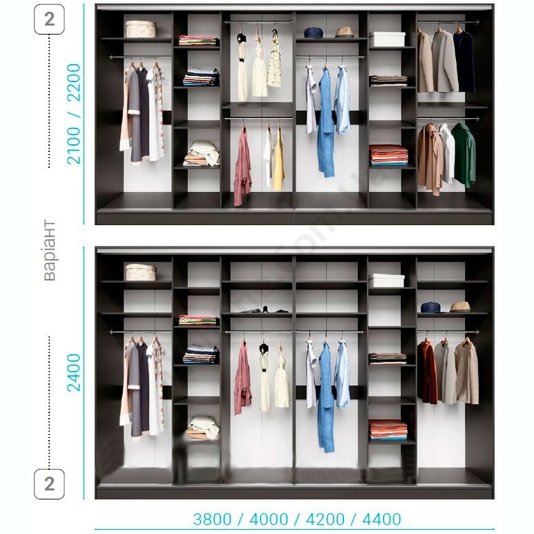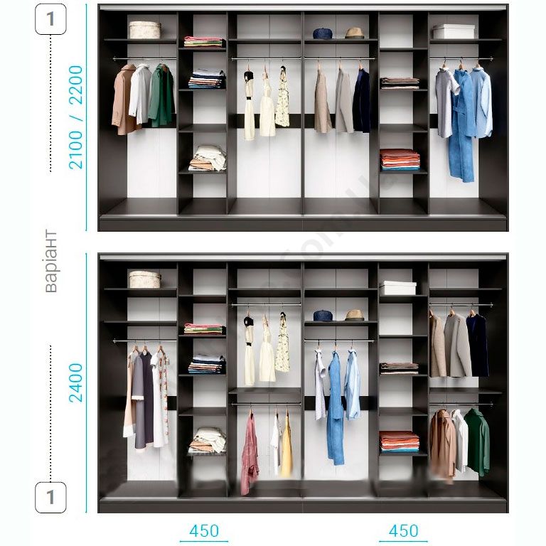 П’ятидверна шафа-купе шириною 420 см, глибиною 45 см, висотою 210, 220 чи 240 см.