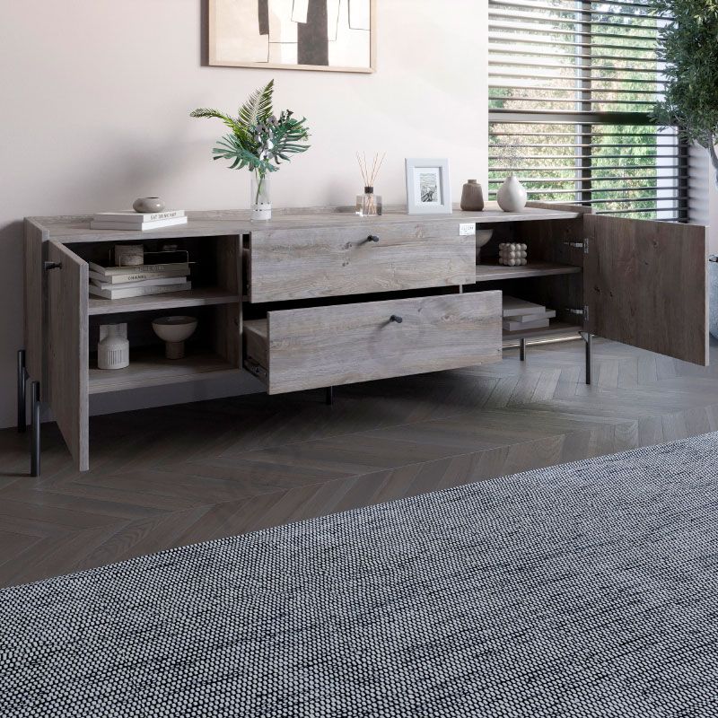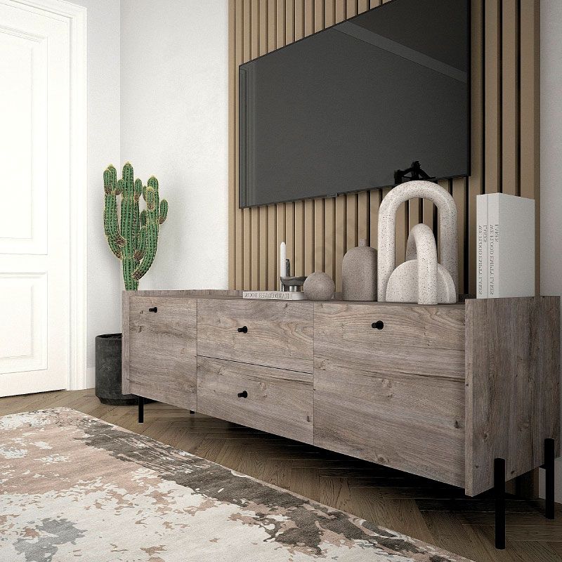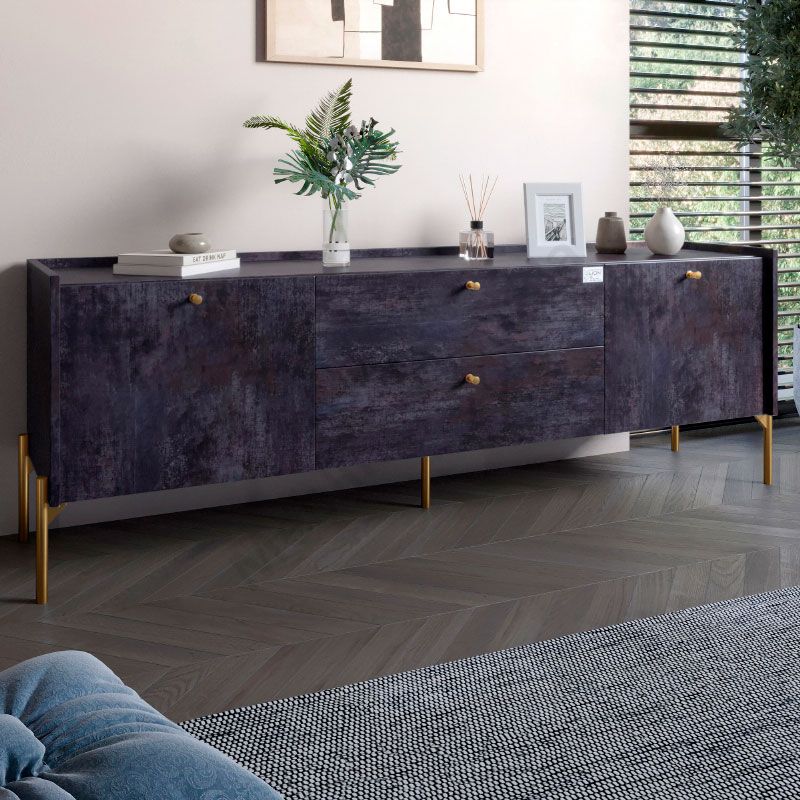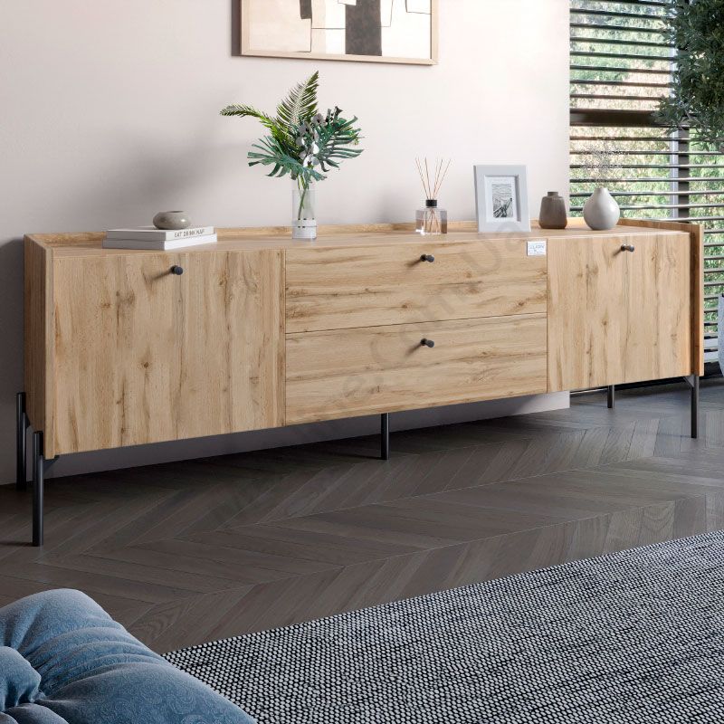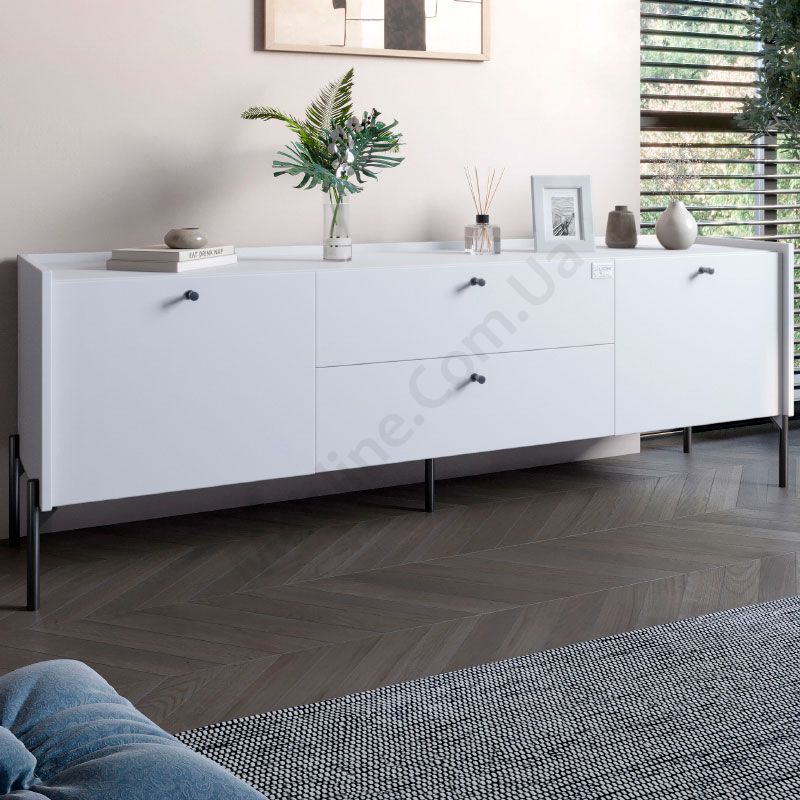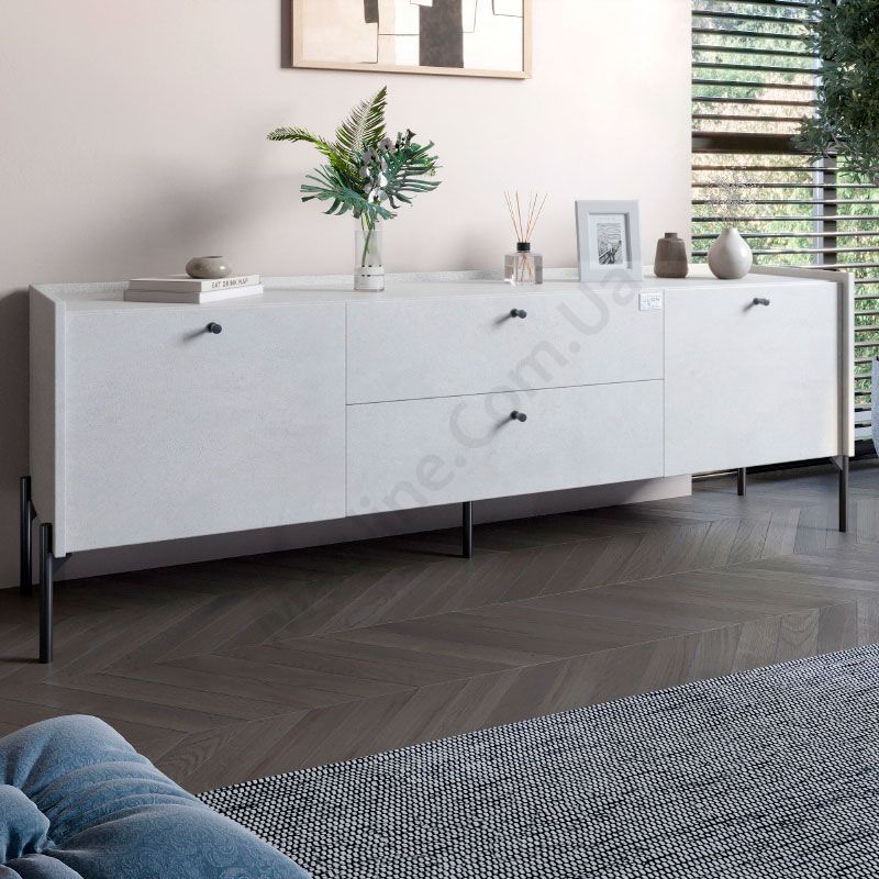 Тумба під телевізор з висувними шухлядами та дверцятами на металевих ніжках.