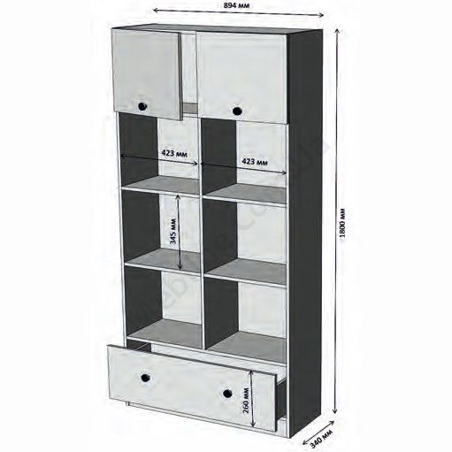 Шафа з відкритими полицями, дверцятами та висувною шухлядою.