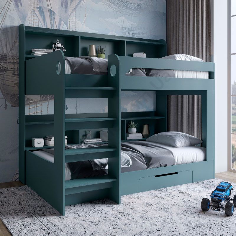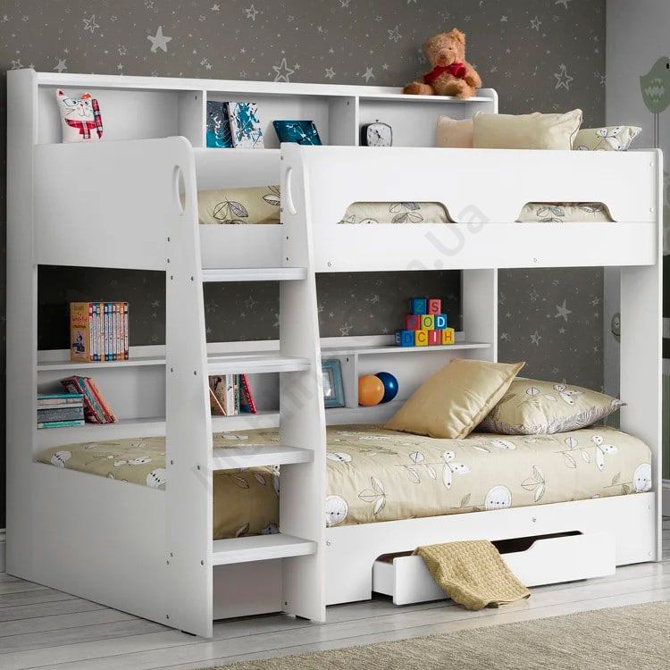 Двох’ярусне ліжко з полицями та ящиком для зберігання.