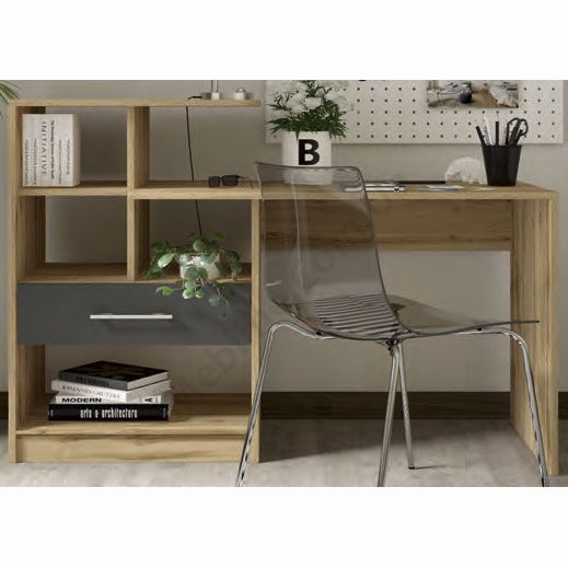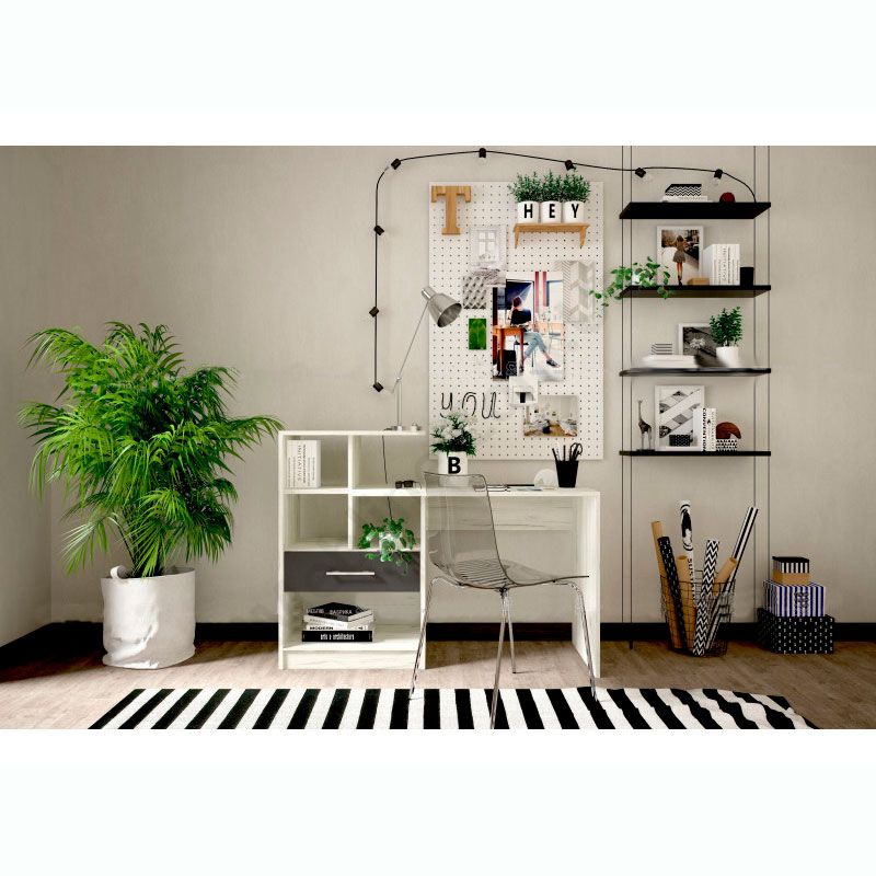 Комп’ютерний стіл з висувною шухлядою та відкритими поличками.