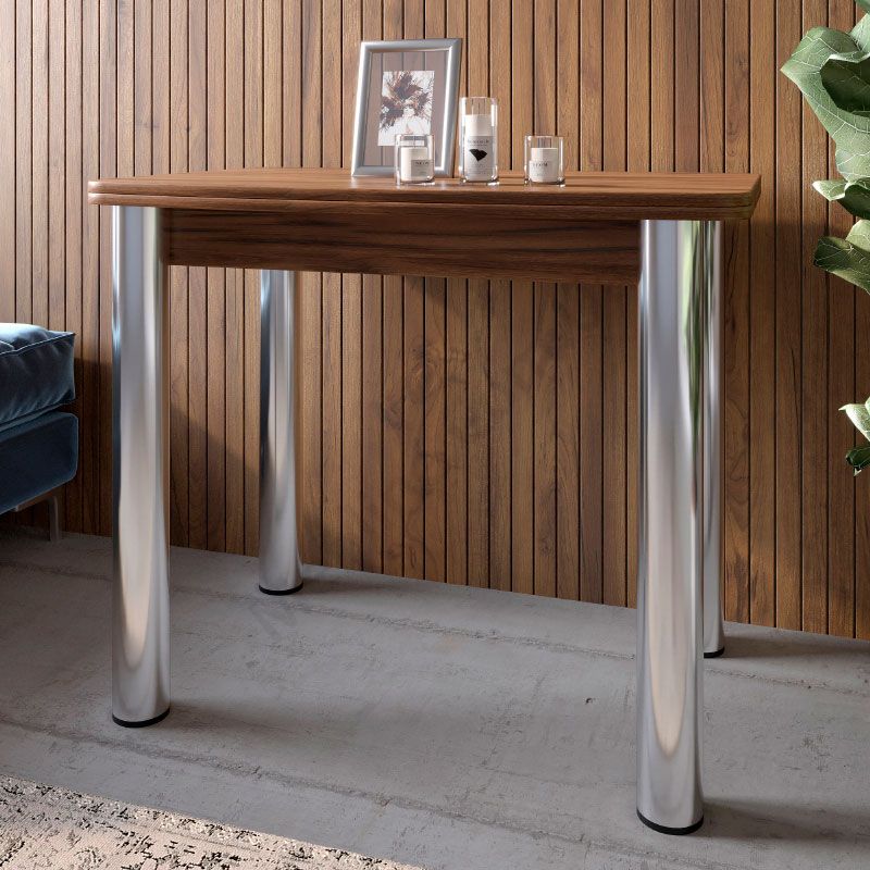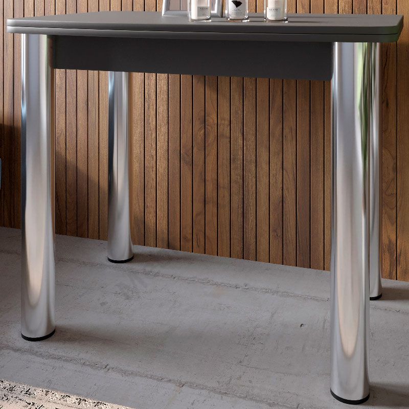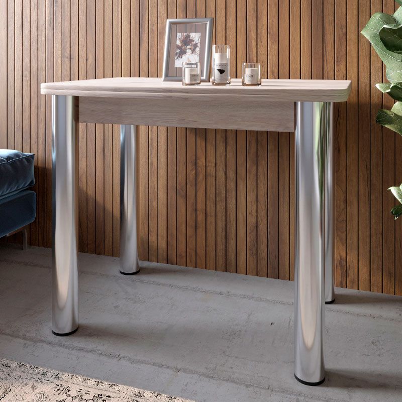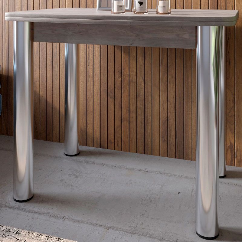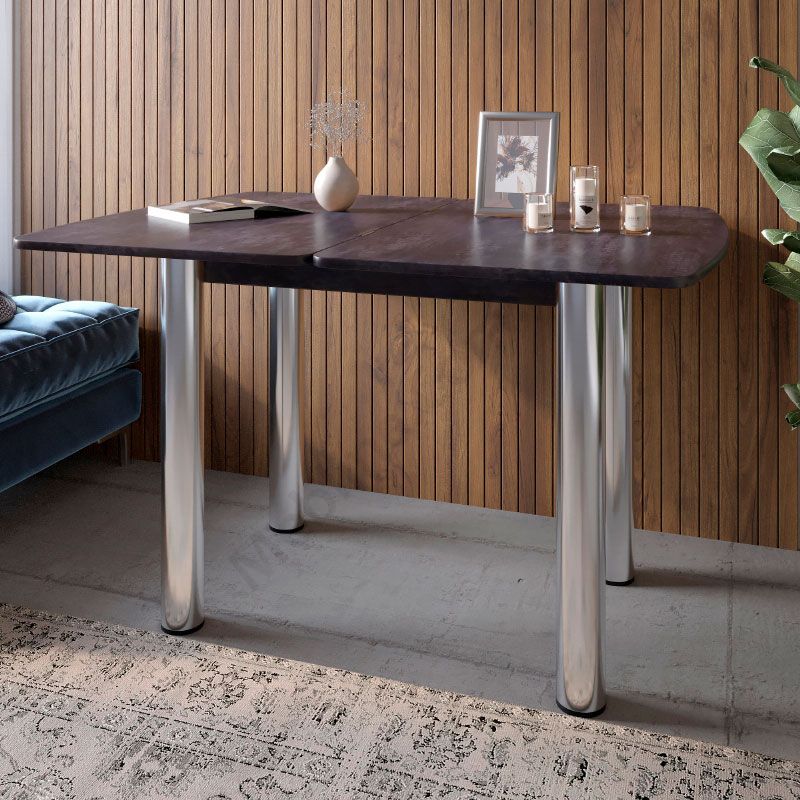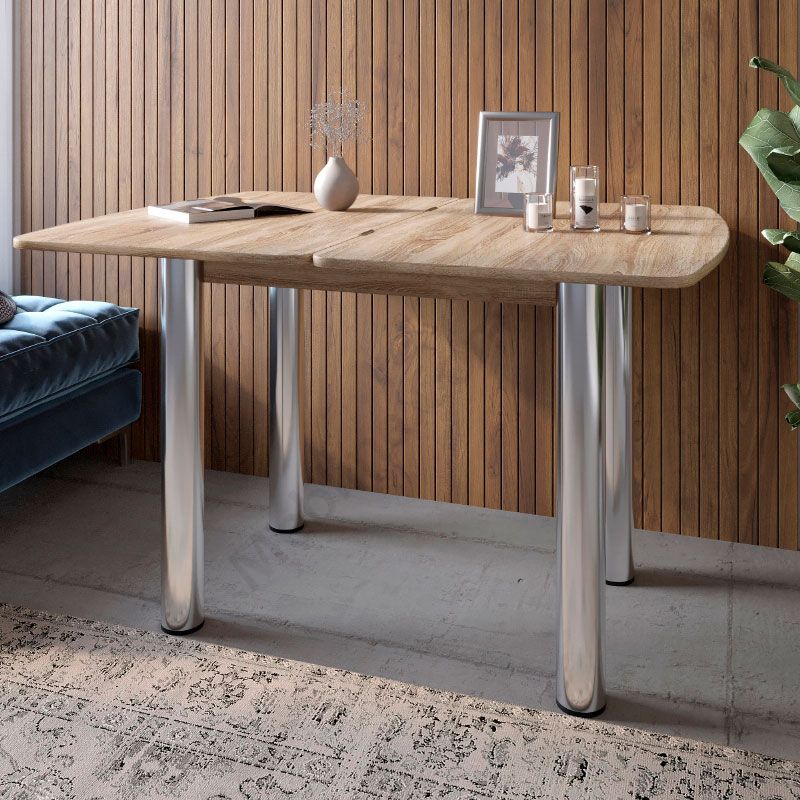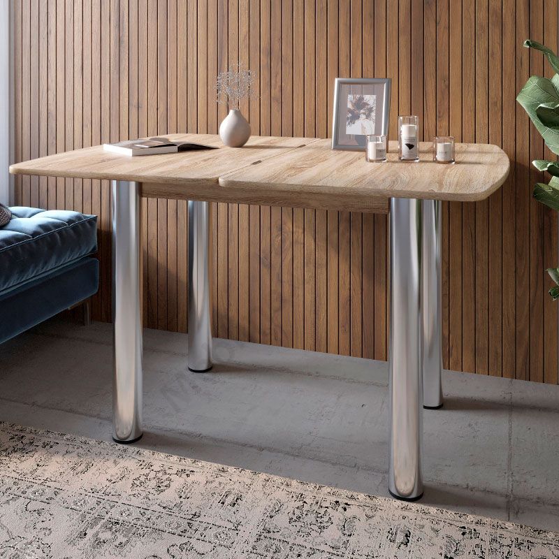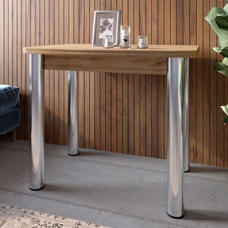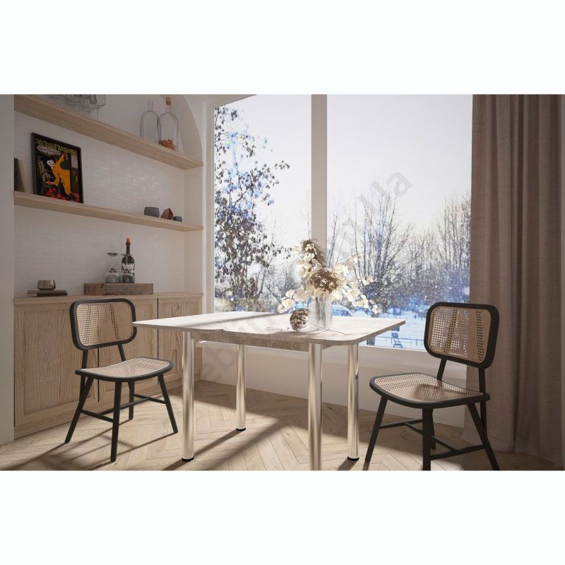 Прямокутний розкладний обідній стіл на металевих ніжках.
