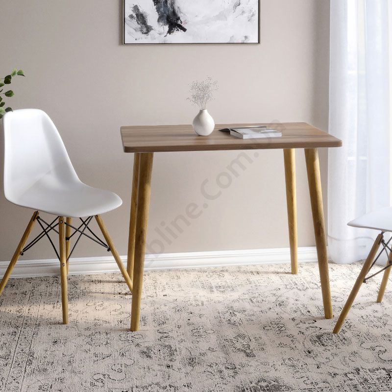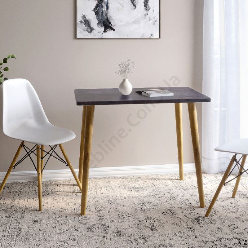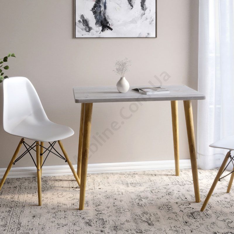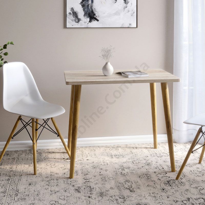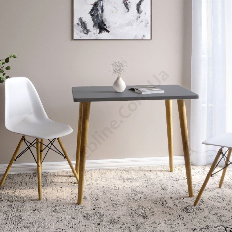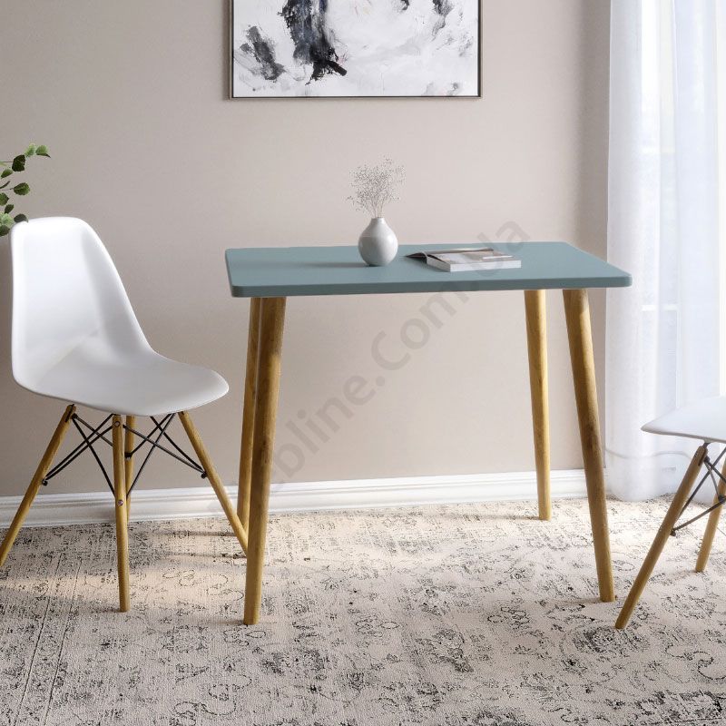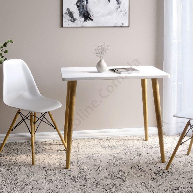 Прямокутний обідній стіл на дерев’яних ніжках.