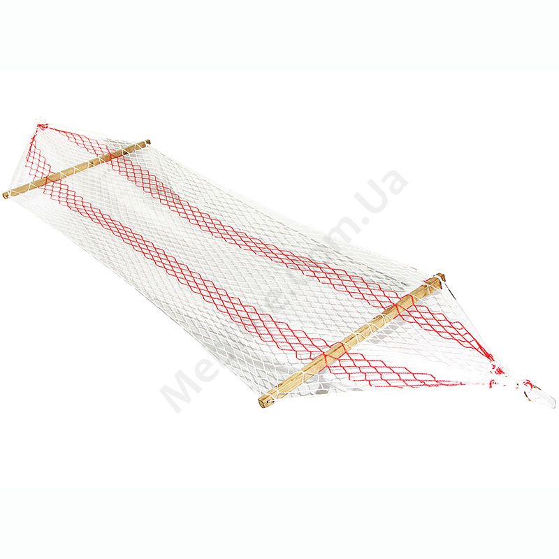 Підвісний гамак з сітки біло-червоного кольору.
