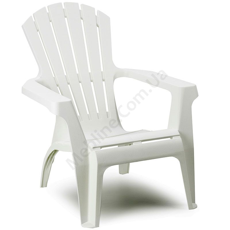 Низький пластиковий садовий стілець з підлокітниками білого кольору.