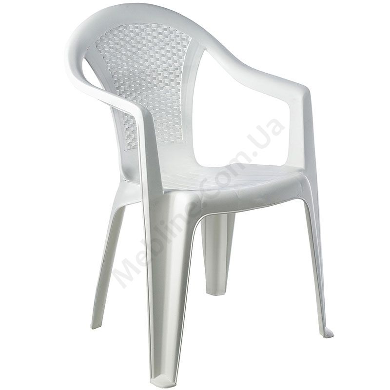 Пластиковий садовий стілець з підлокітниками білого кольору.