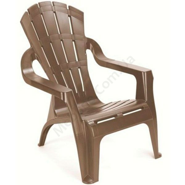 Низький пластиковий садовий стілець з підлокітниками кольору капучіно.