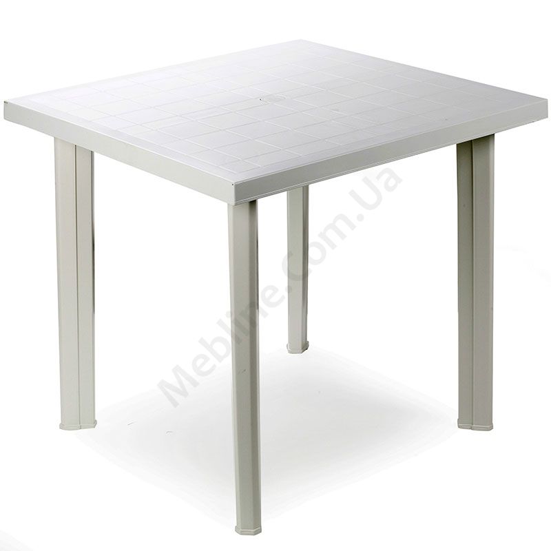 Прямокутний пластиковий стіл білого кольору з отвором для парасольки.