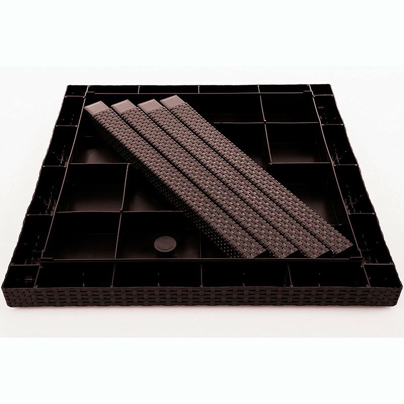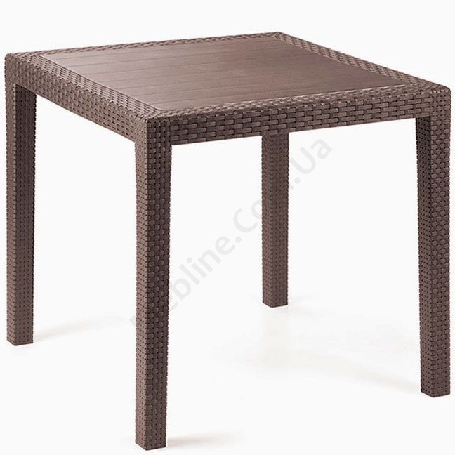 Квадратний пластиковий стіл коричневого кольору з імітацією плетіння ротангу.