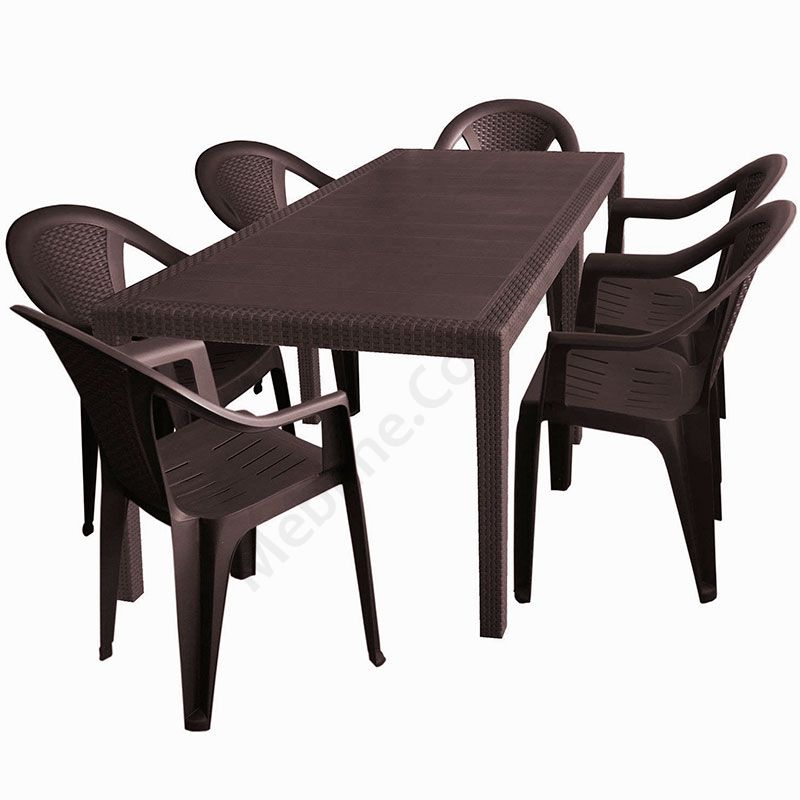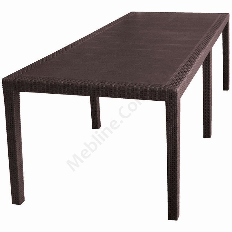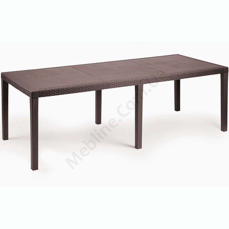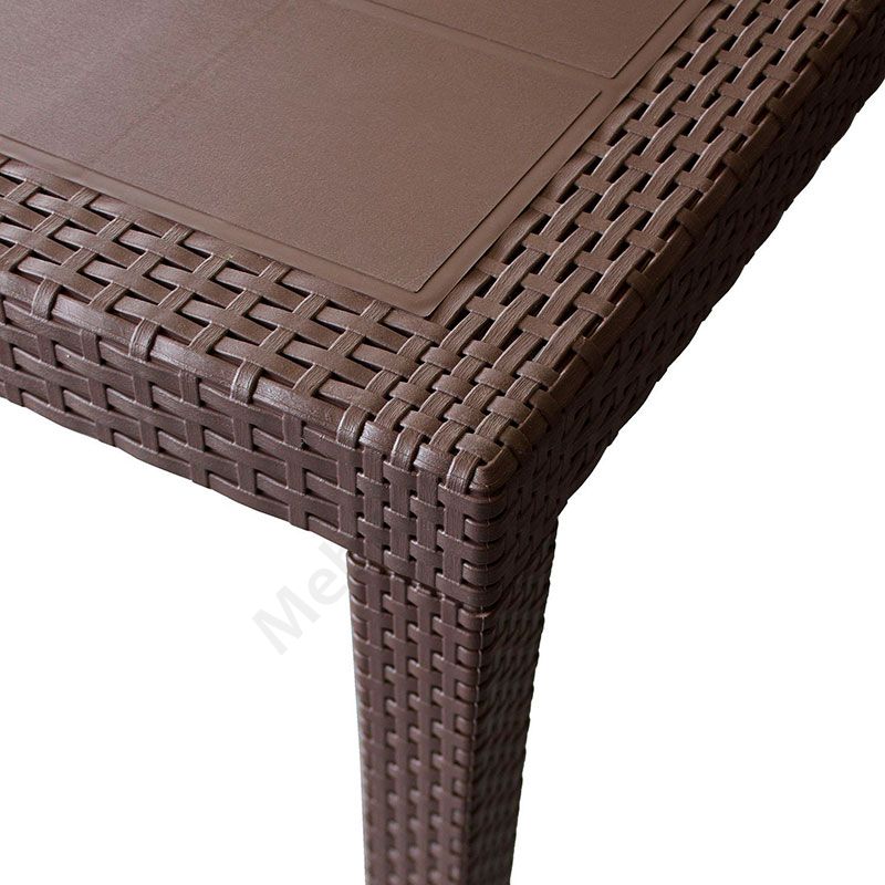 Великий розкладний пластиковий стіл коричневого кольору з імітацією плетіння ротангу.
