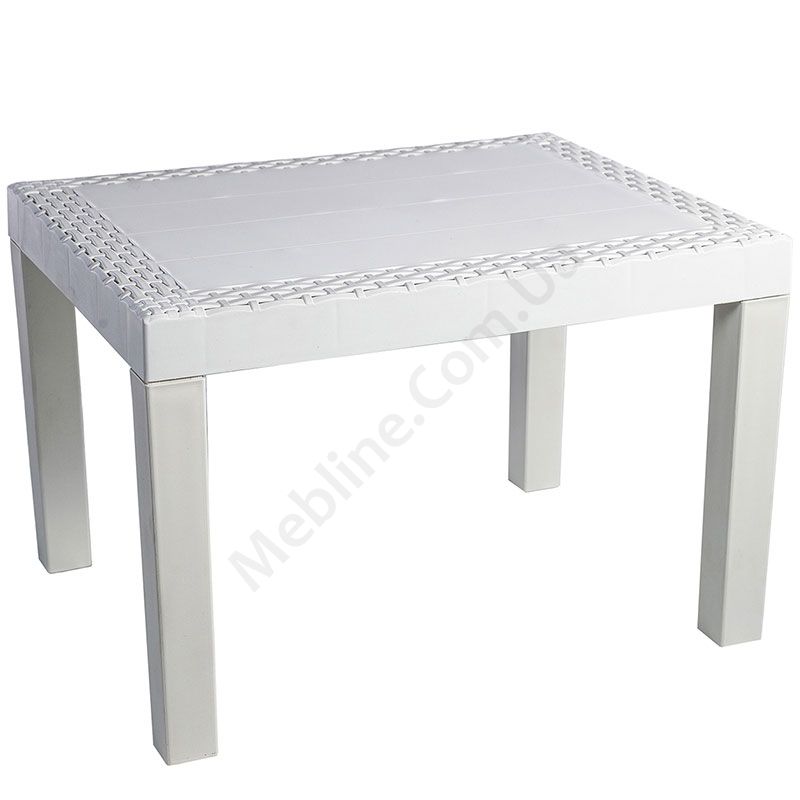 Низький прямокутний пластиковий стіл білого кольору з імітацією плетіння ротангу.