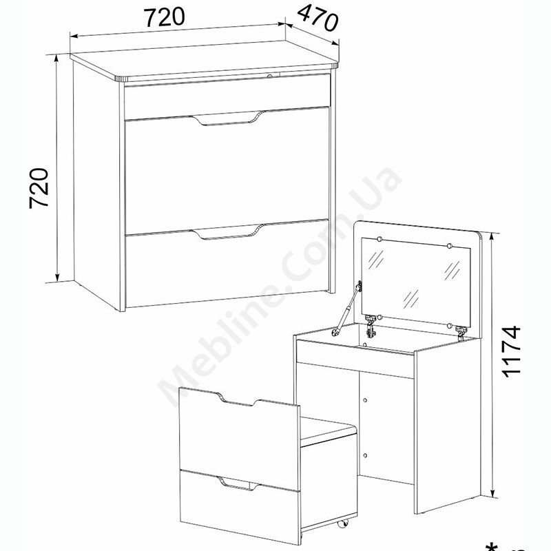 Туалетний столик з дзеркалом, що відкривається, пуфом та коробом.