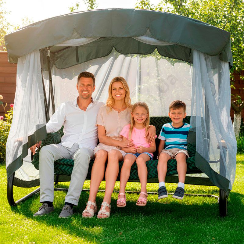 Садова гойдалка з відкидною спинкою та москітною сіткою на чорному матовому каркасі.