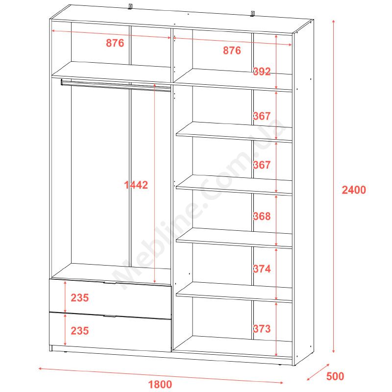 Розпашна чотиридверна шафа з висувними шухлядами та антресолями.
