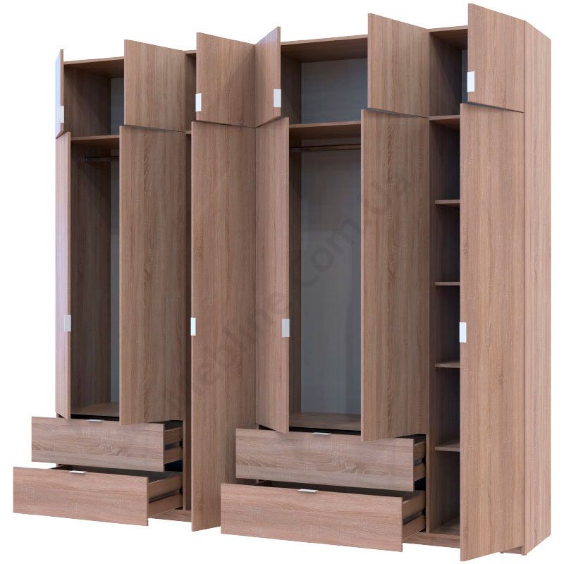 Розпашна шестидверна шафа з висувними шухлядами та антресолями.