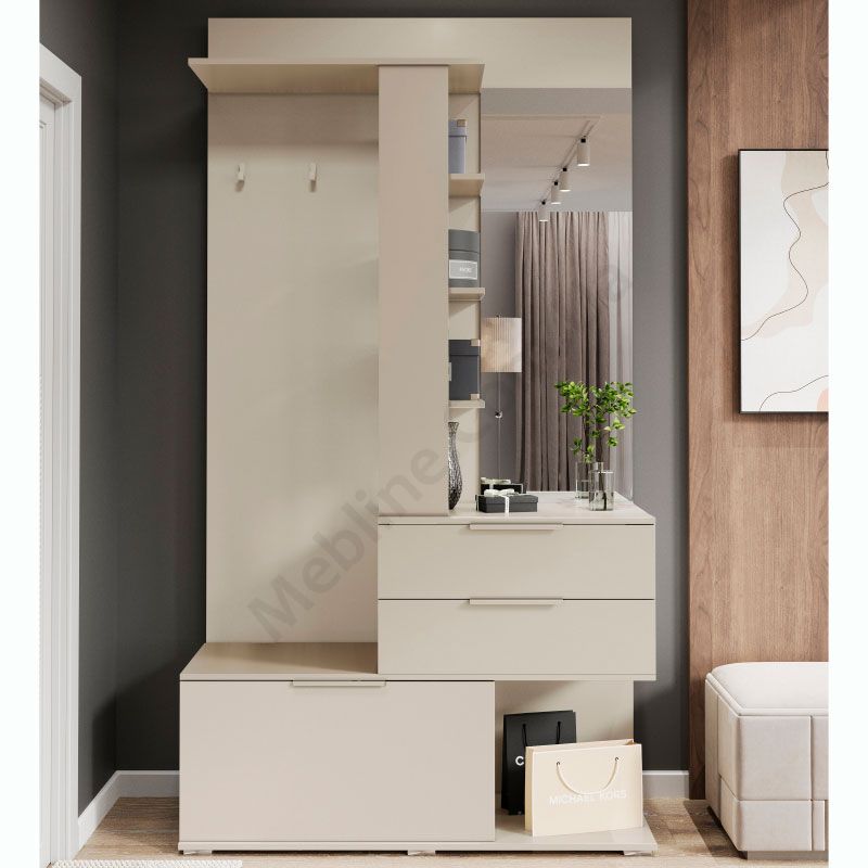 Передпокій з дзеркалом, вішаком, полицями та шухлядами.