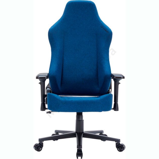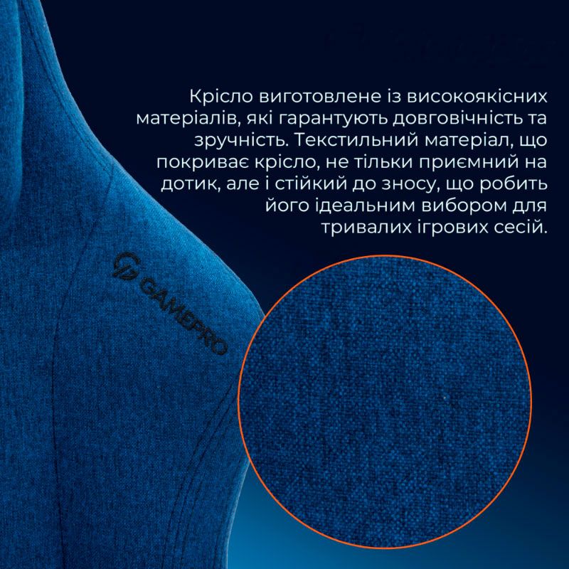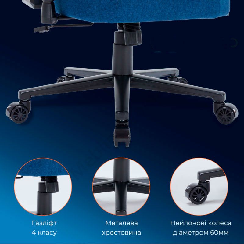 Геймерське крісло з бічною підтримкою, механізмом Tilt, вільним гойданням, текстильною оббивкою темно-синього кольору.