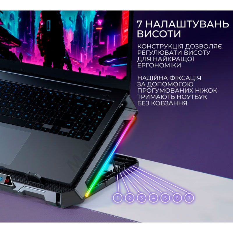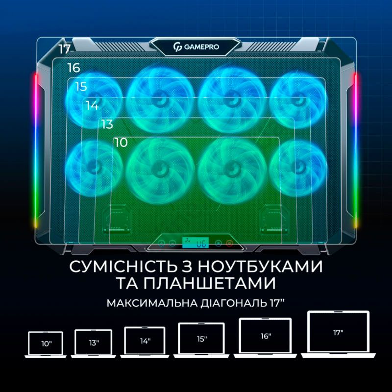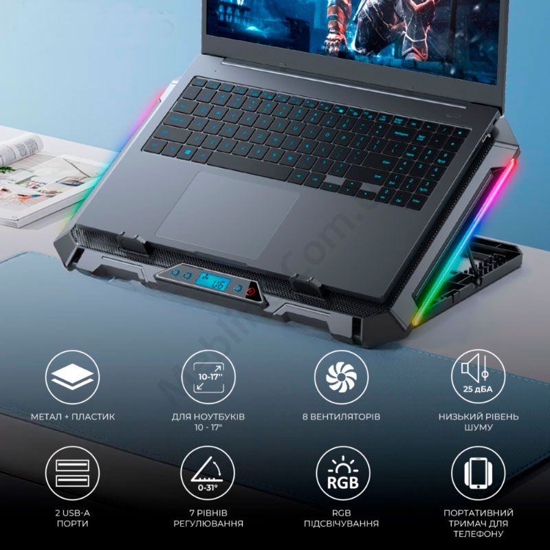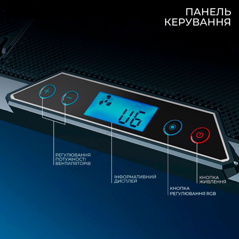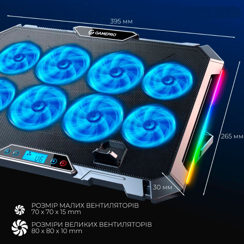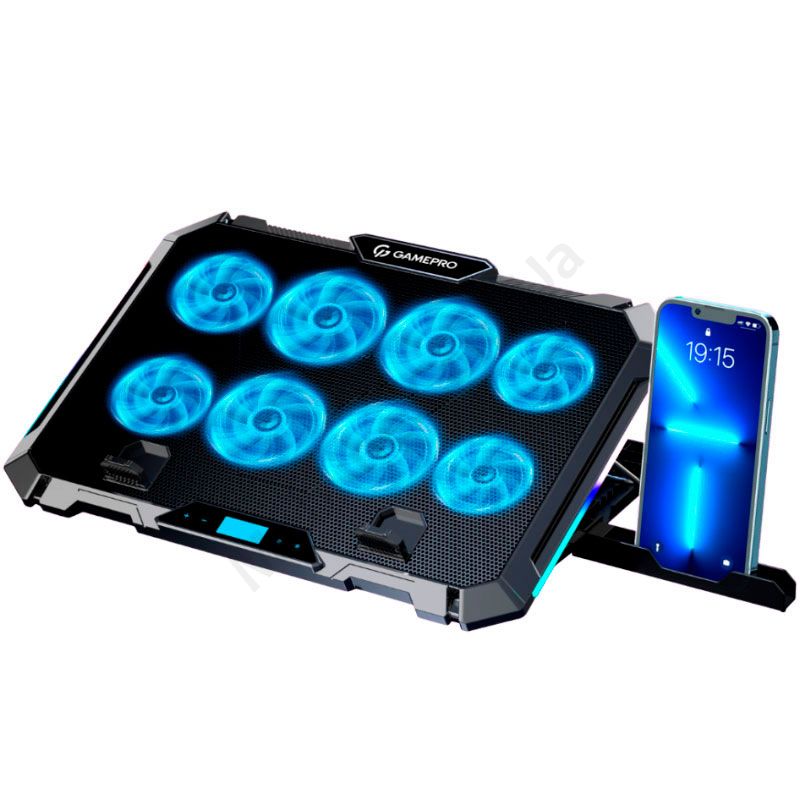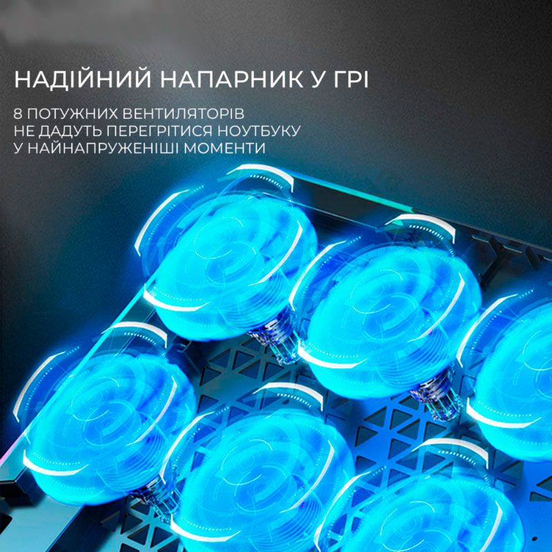 Охолоджуюча підставка під ноутбук з вісьмома вентиляторами та панеллю управління.