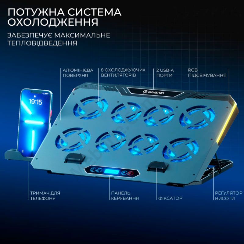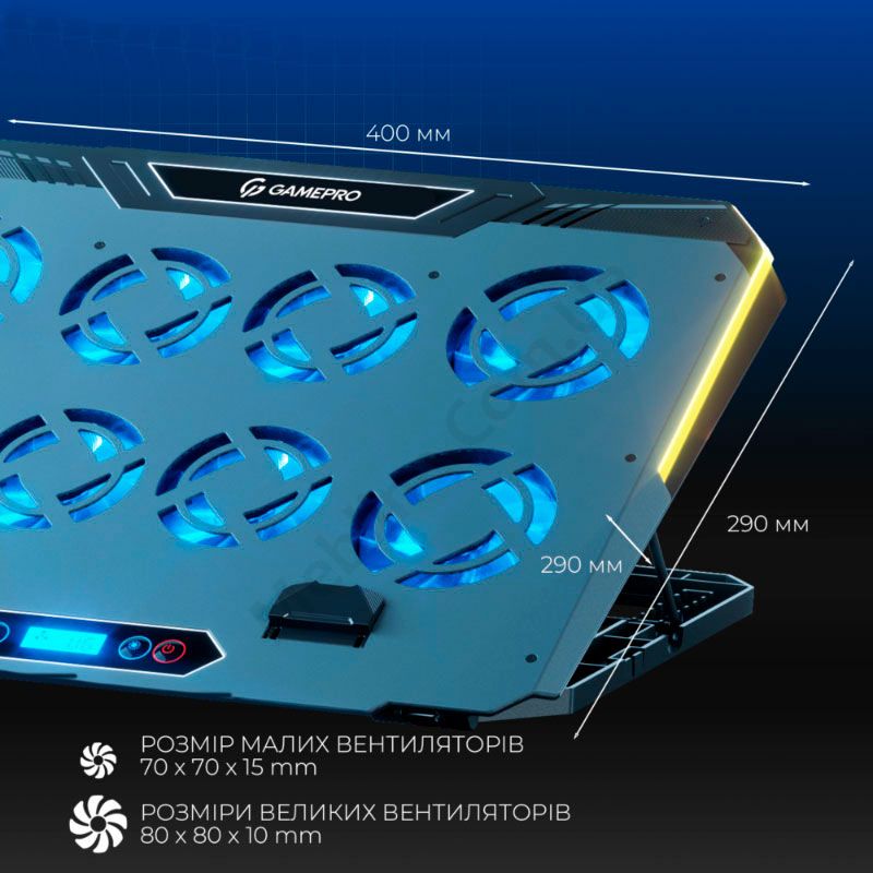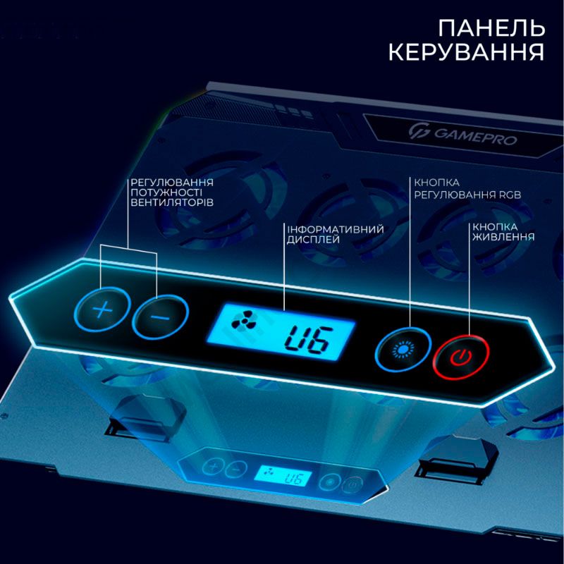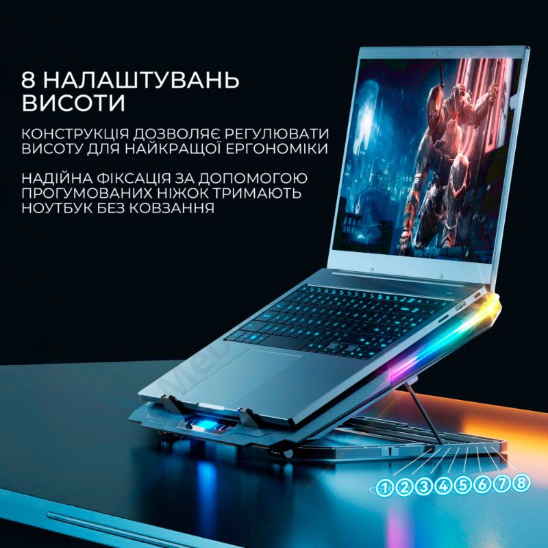 Охолоджуюча підставка під ноутбук з вісьмома вентиляторами та панеллю управління.