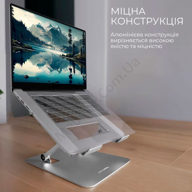 - Піднімає ноутбук до рівня очей або до рівня другого монітора, забезпечує кращу циркуляцію повітря.