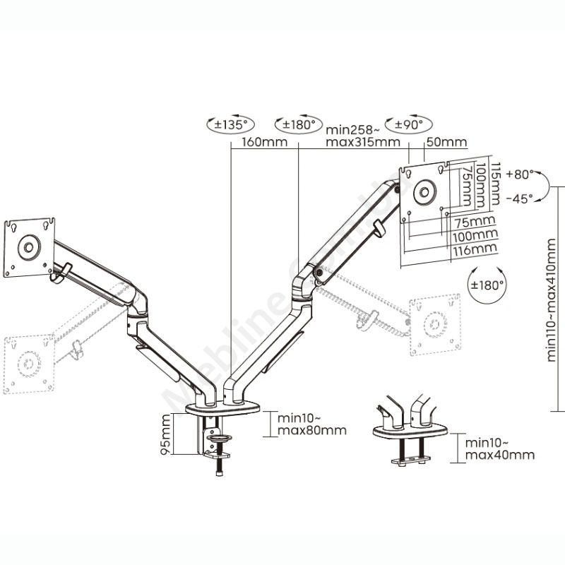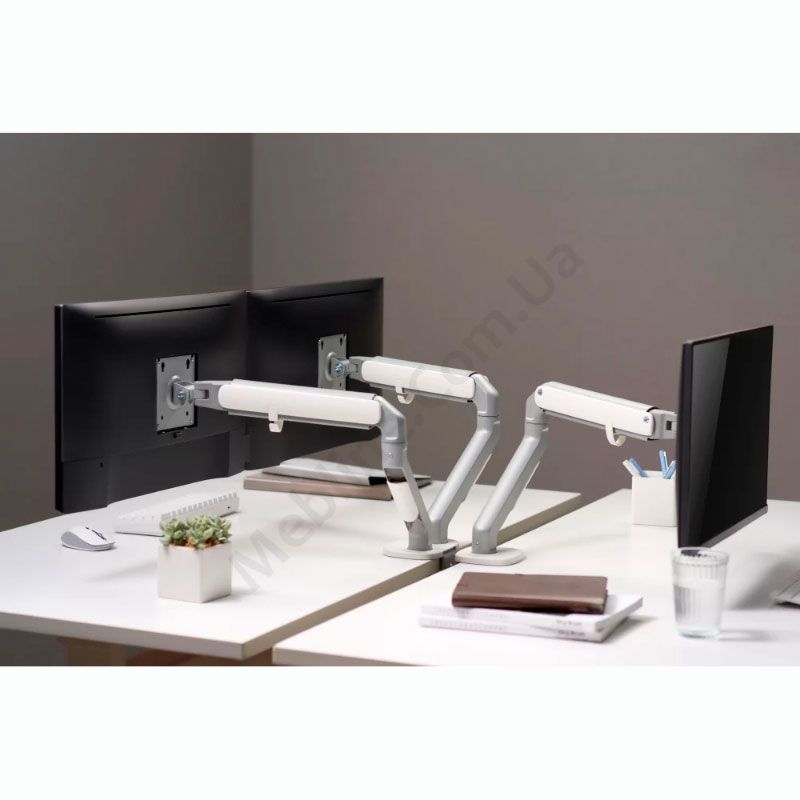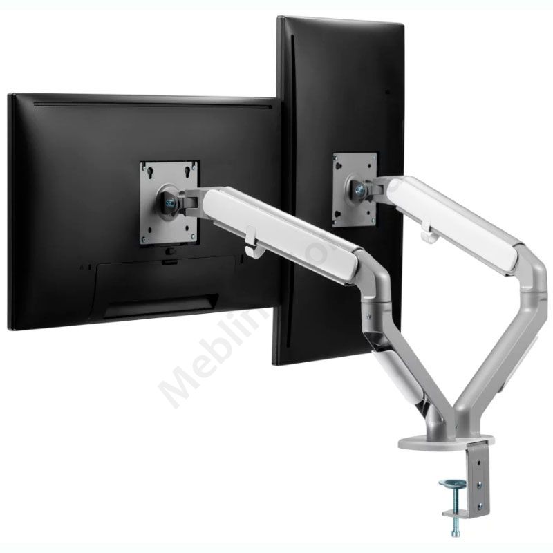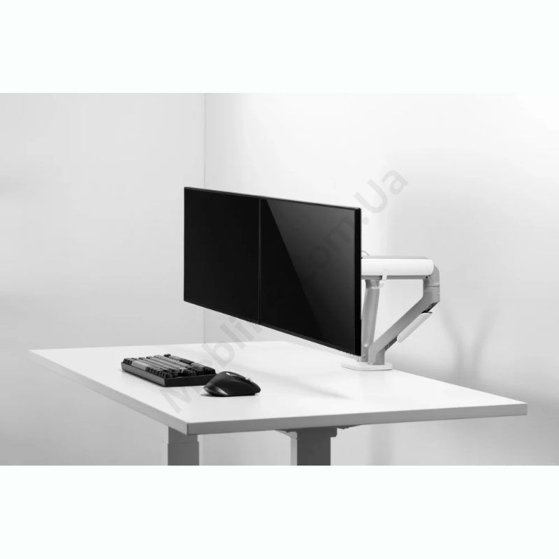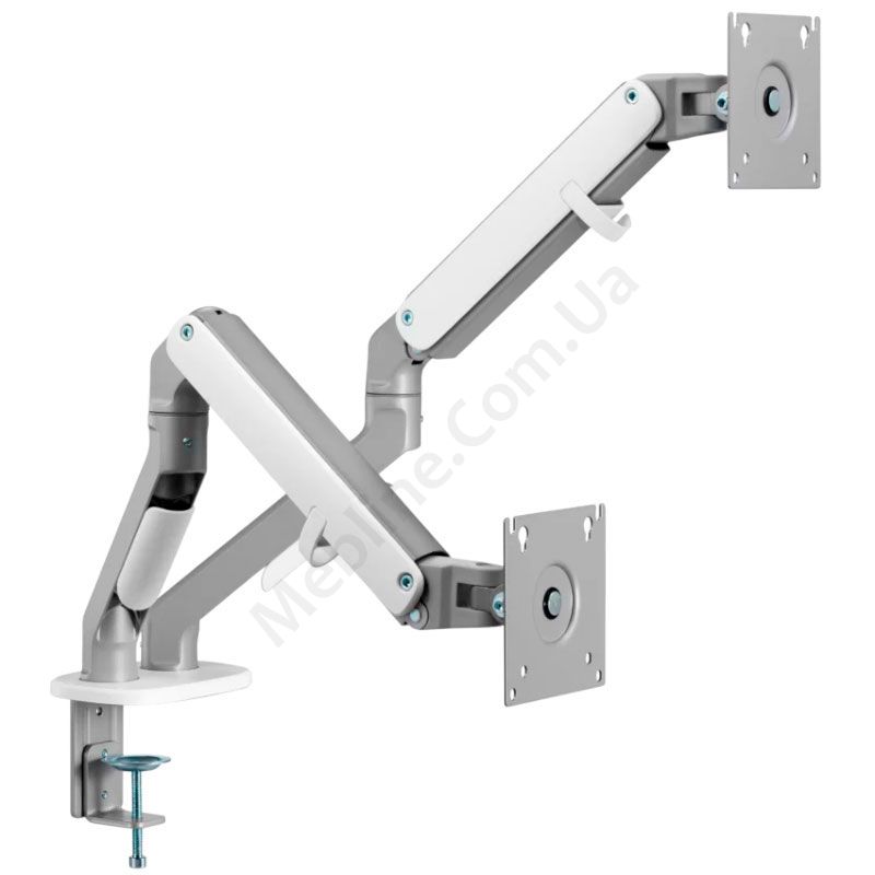 Настільний кронштейн для двох моніторів до 32 дюймів, сіро-білого кольору.